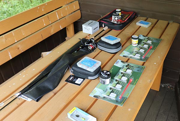 Jugendwart Matze hat ordentlich eingekauft. Diesmal in Richtung "Forelle". Von Kleinkram über Köder bis hin zu Rute und Rolle. Da darf sich jeder gleich was aussuchen..