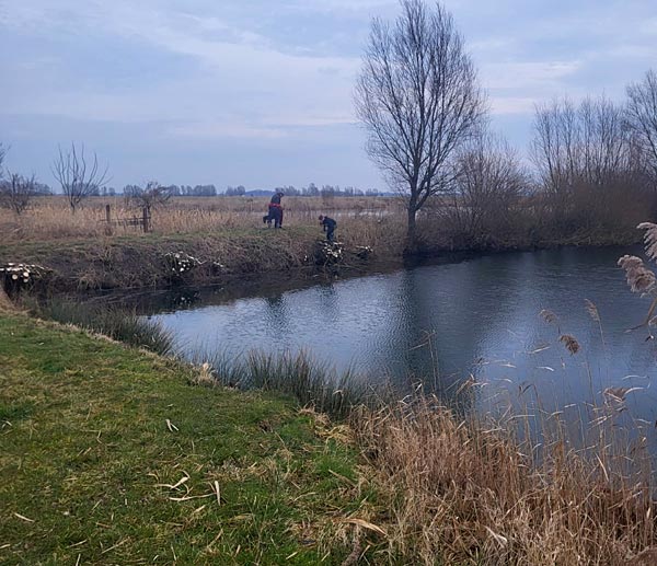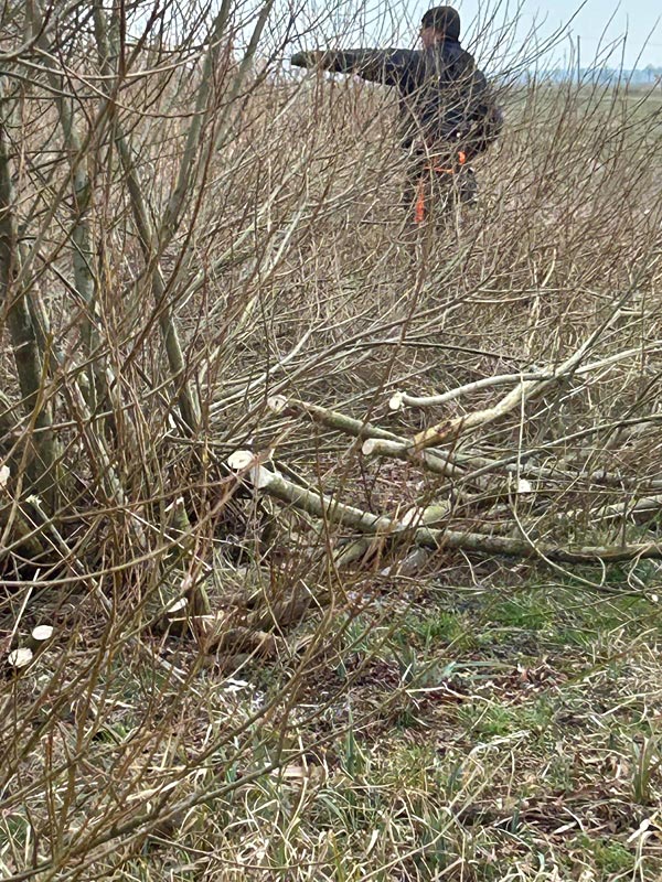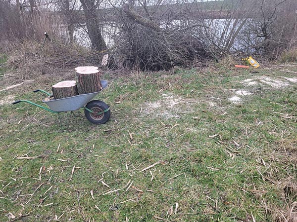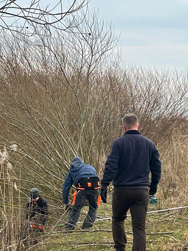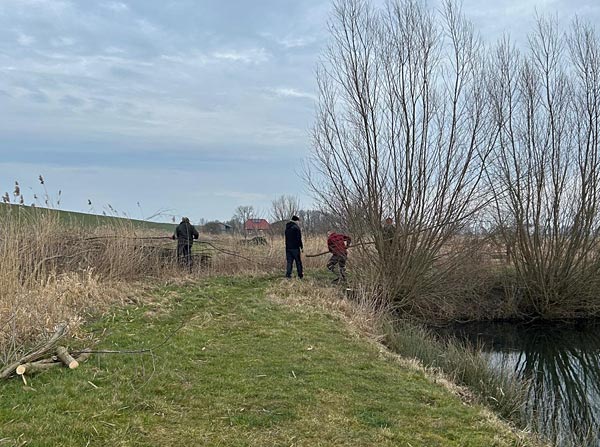 Bei wirklich gutem „Arbeitswetter“ trafen wir uns direkt am Teich Rechtenfleth. Die Beteiligung war super, die Stimmung auch. Alle, die zugesagt hatten, erschienen auch, dabei drei Mitglieder mit Sägeschein.