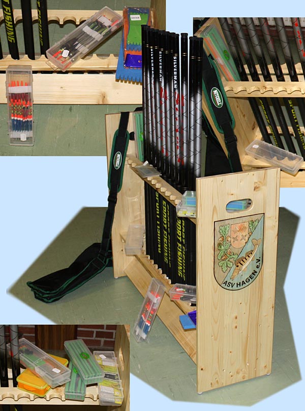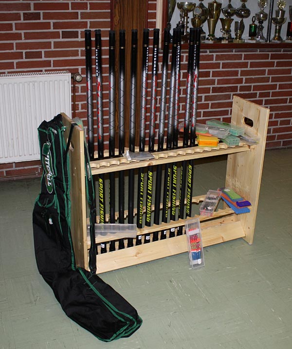 und ein selbstgebauter Rutenständer, der bis zu 53 Ruten aufnehmen kann ..