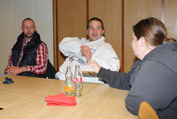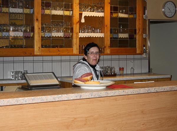 Petra wartet auf Interessenten für die letzten Brötchen. Die Bewirtung hat der Verein selbst übernommen, Überschüsse kommen auch hier der Jugendkasse zu Gute - sozusagen Mettbrötchen und Bier für einen guten Zweck!
