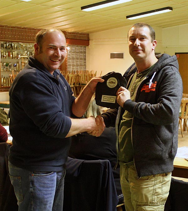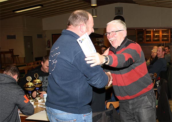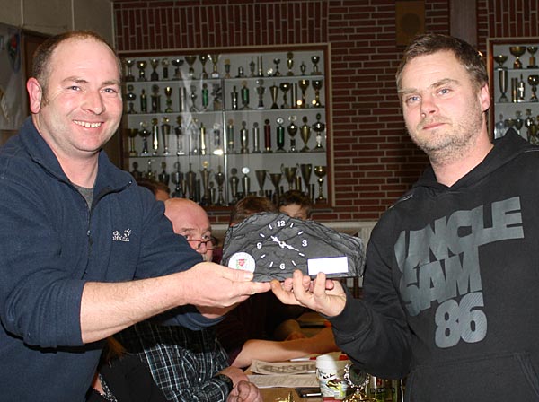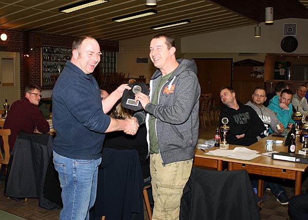 Rouwen hätte durchaus Grund zum Lachen: die Vereinsmeisteruhr hat er sich mit einem 91er Hecht gesichert und damit beim letzten Angeln des Jahres das Feld von hinten aufgerollt.