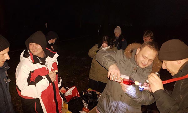 Im Dunkeln ging die Sonne auf, als Lennart endlich kam - er hatte sich verspätet, von unserem Getränkeengpass erfahren und als Retter in der Not eine Flasche Rhabarber-Vanille dabei.......