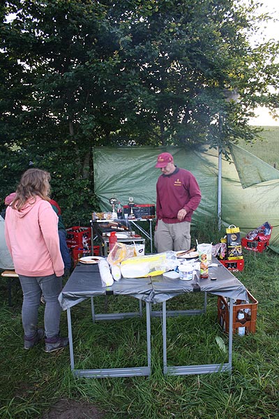 Andere lassen es gemütlich angehen - ist ja noch lange hell. Der Grill jedenfalls beginnt seine Arbeit.