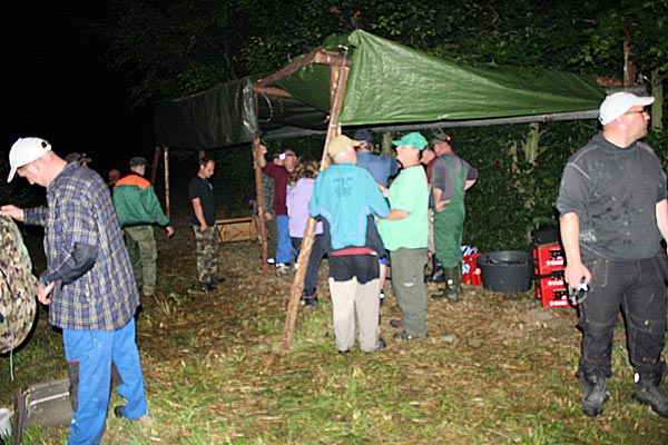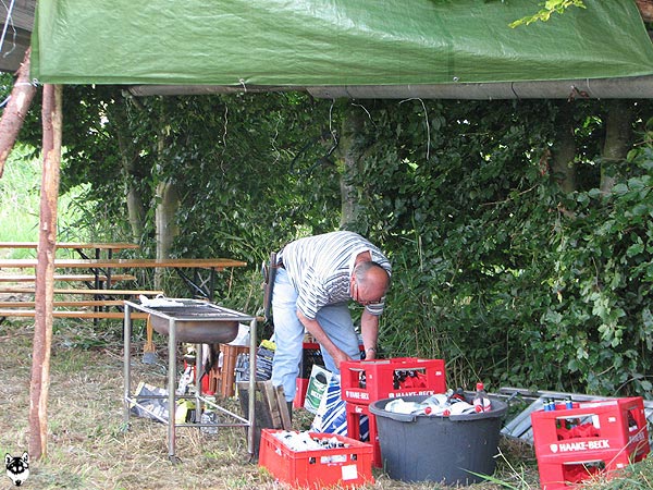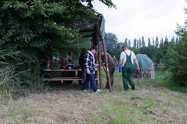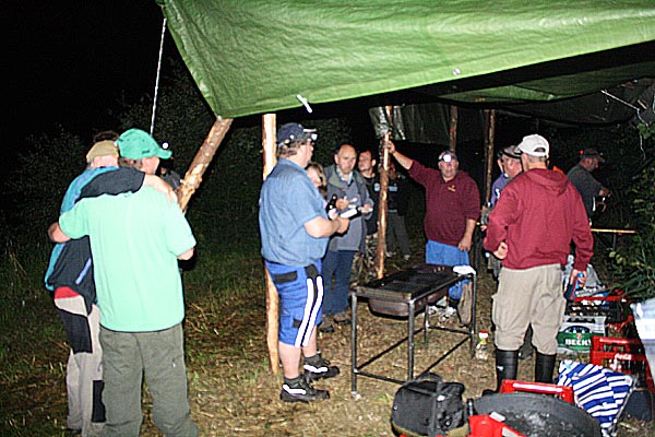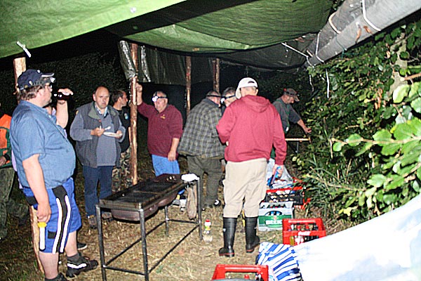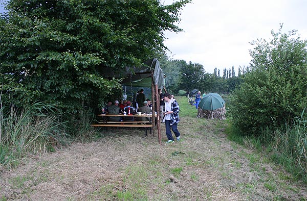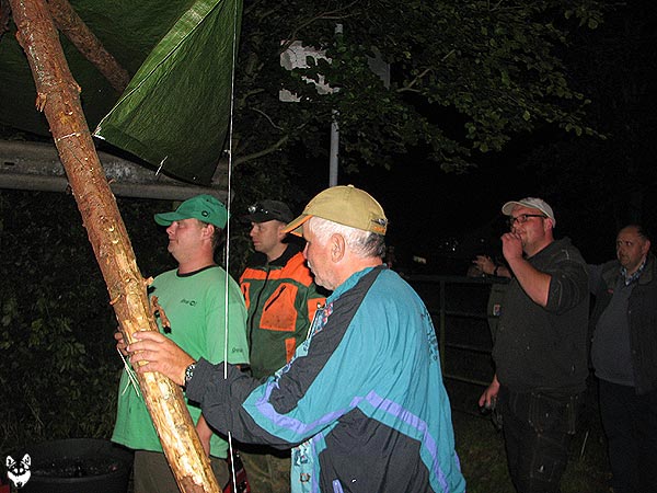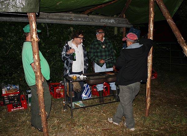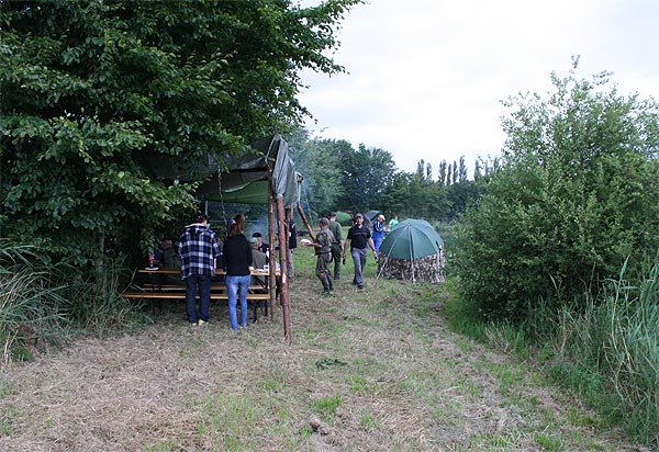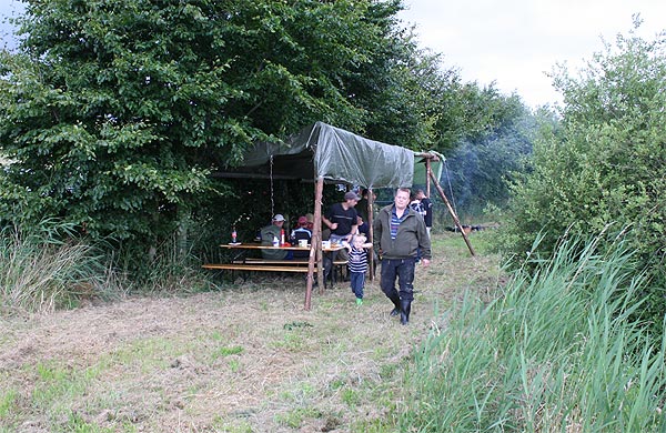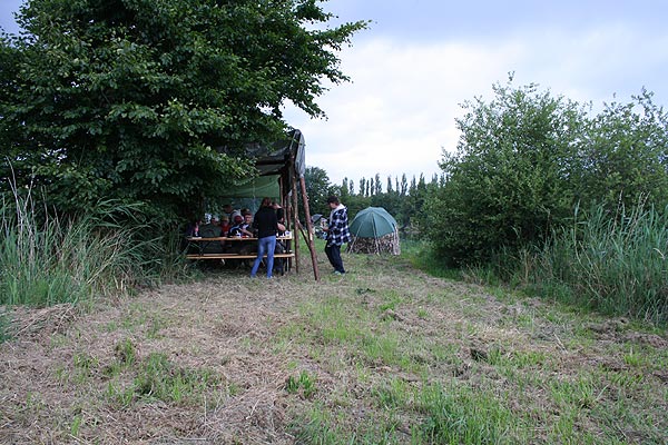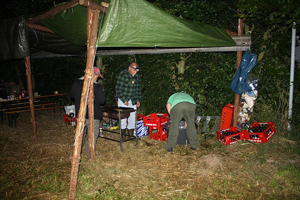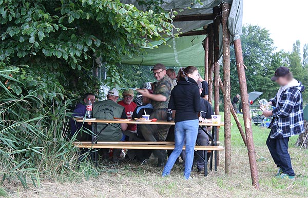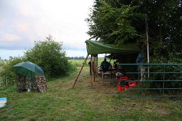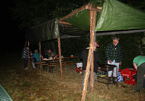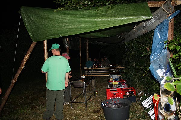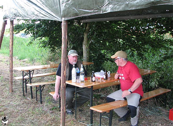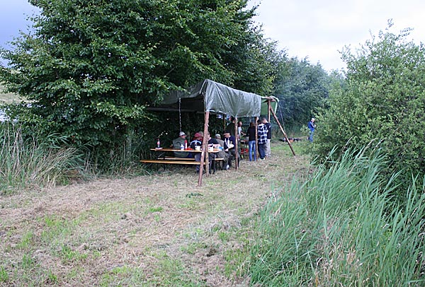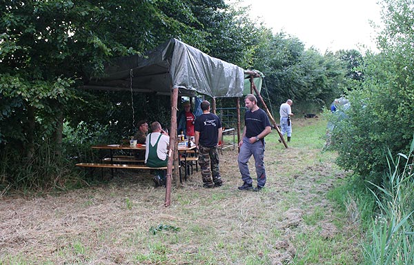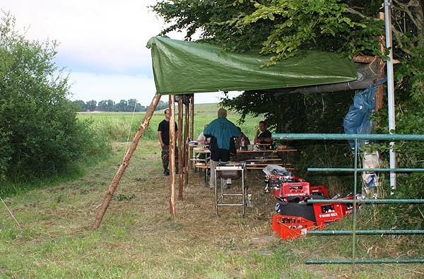Das Wetter machte uns zunächst Sorgen: am Nachmittag teils heftige Gewitterschauer, für den Abend war Regen vorhergesagt. Kurzentschlossen rückte Rüdiger aus und baute mit Unterstützung von unserem 2. Vorsitzenden, Uwe, einen sturm- und regenfesten Unterstand aus Pfählen, Leitplanken, Planen und Tüdelband.
