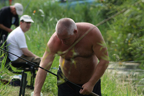 Endlich läuft bei Matze was! Nach langem Zerren im kraut löst sich der Fisch und ein guter Aal kommt zum Vorschein!