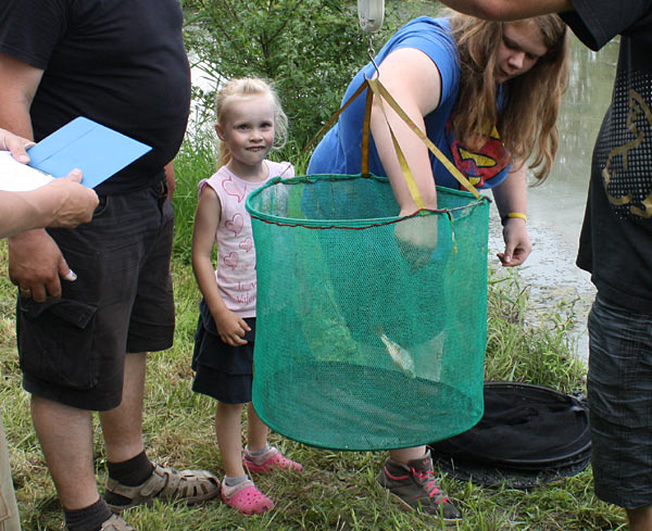 Nochmal alle den Aal bestaunen...vielleicht hüpft er ja vor dem Wiegen wieder aus dem Eimer?