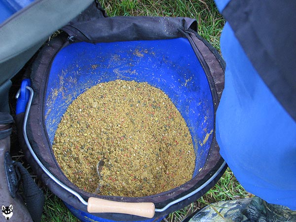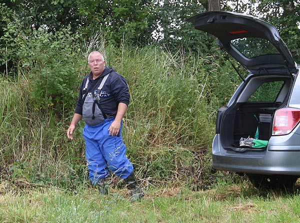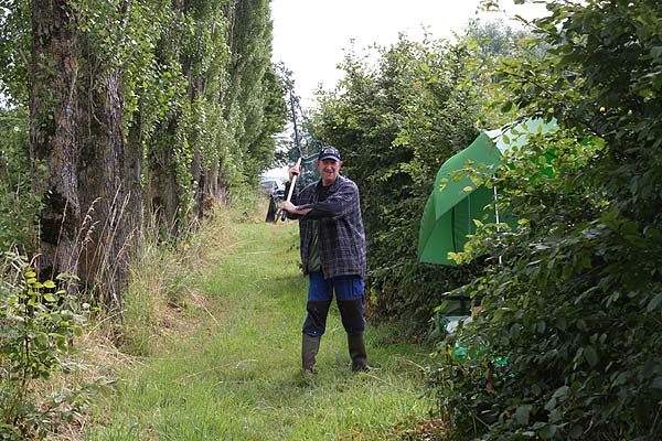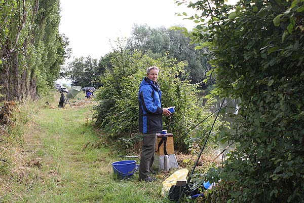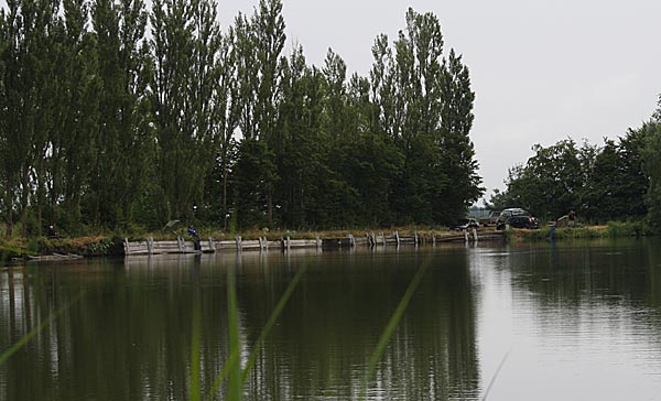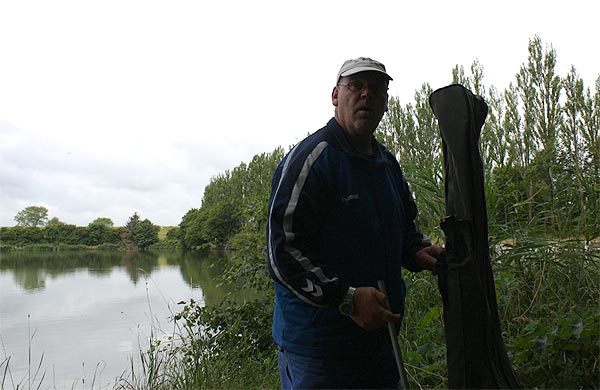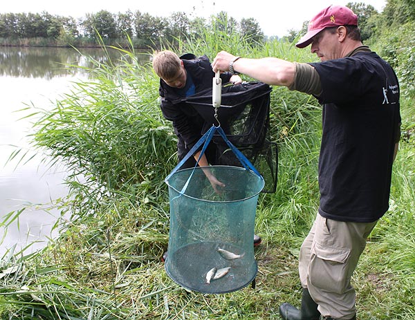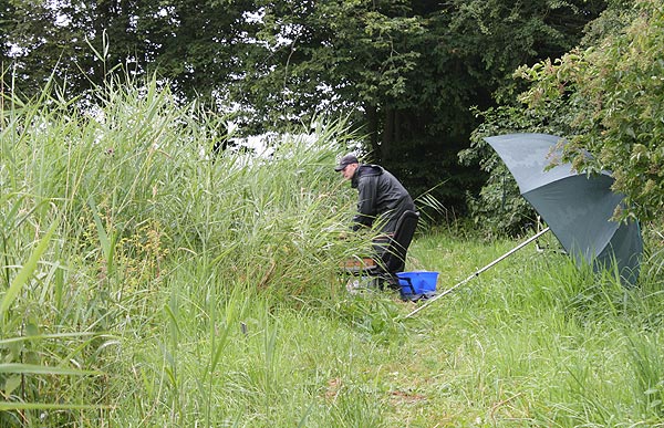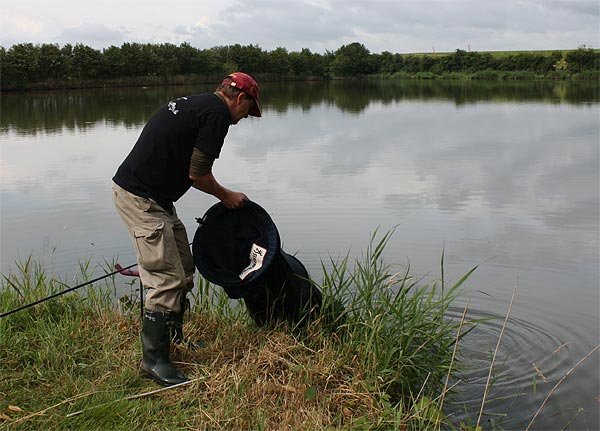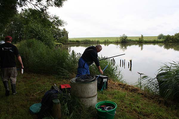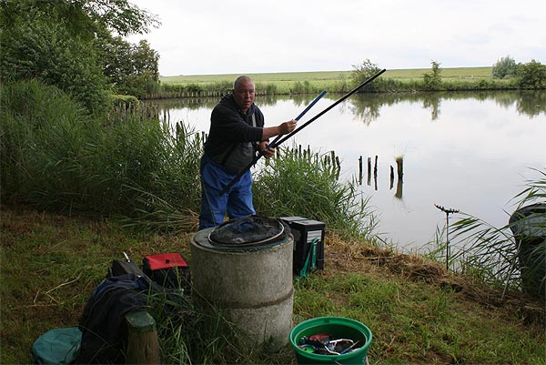 Die Rute voll aufgeladen wirft Andreas seinen Futterkorb auf den weit draußen liegenden Platz.