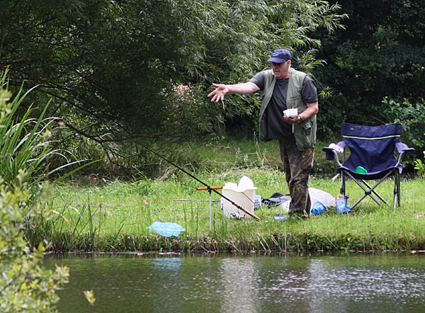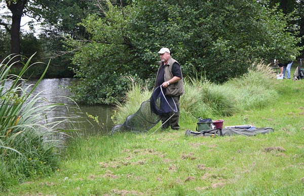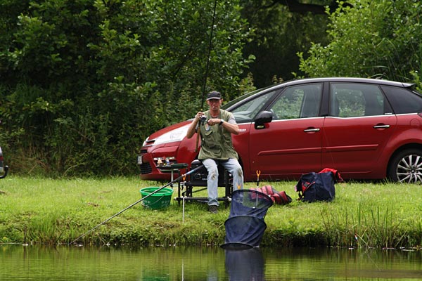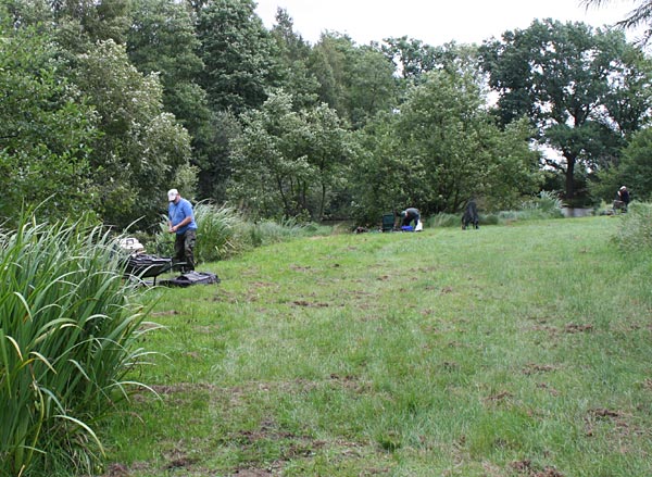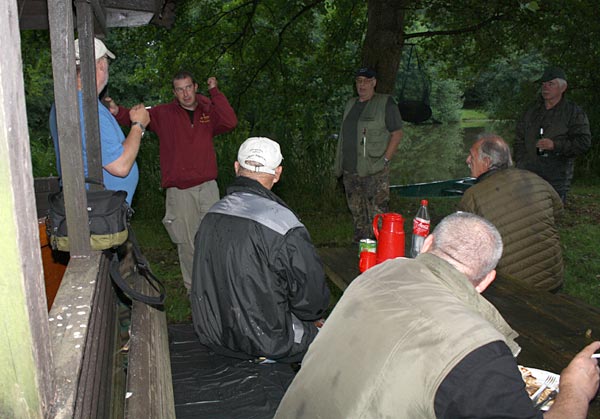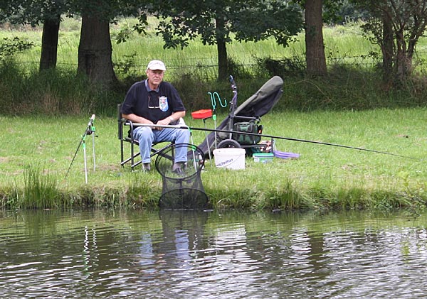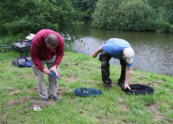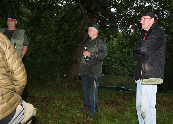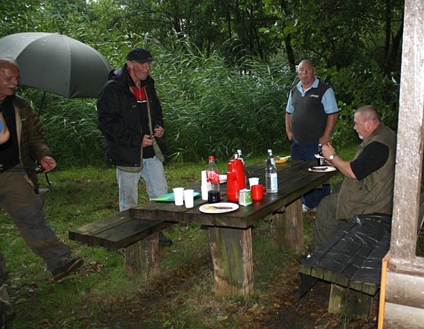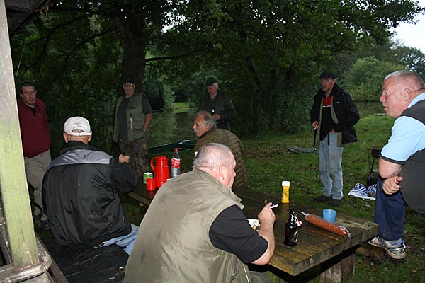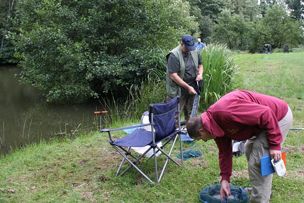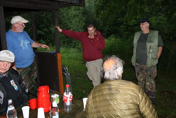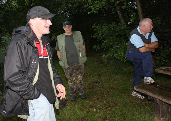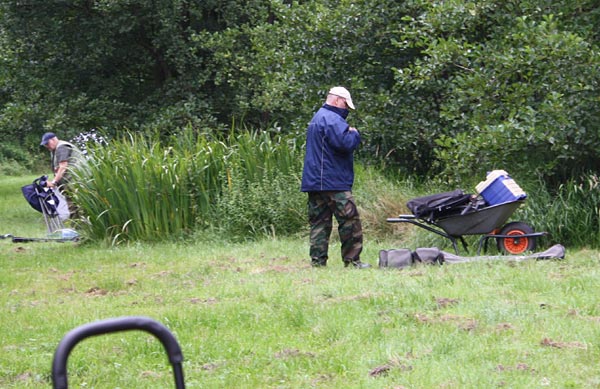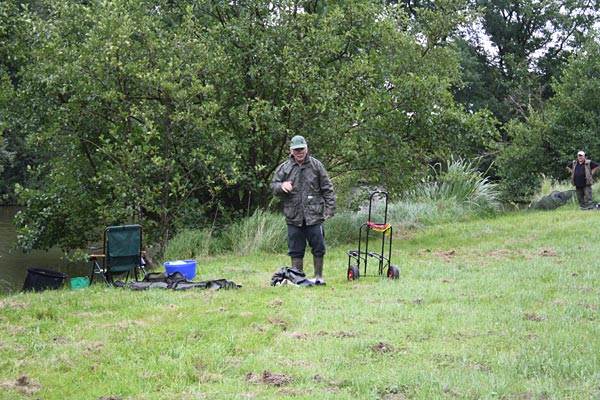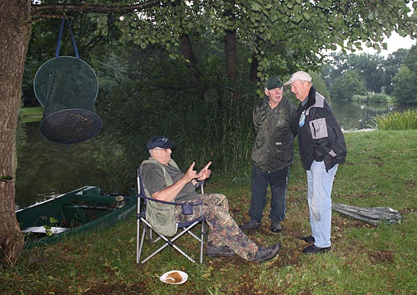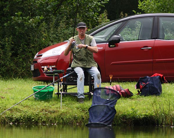 Unser Ehrenvorsitzender Heinrich war leider verhindert - so war sein Stammplatz diesmal in der freien Verlosung und Roland freut sich über den kurzen Weg zum Platz. Da es in den letzten Tagen immer wieder kräftige Schauer gab, konnten die Angler leider nicht das Gewässer entlang fahren. Einige Stellen der Wiese waren einfach zu nass.