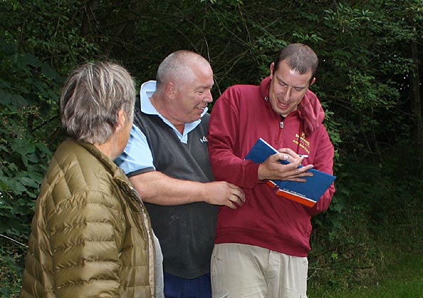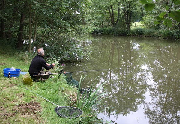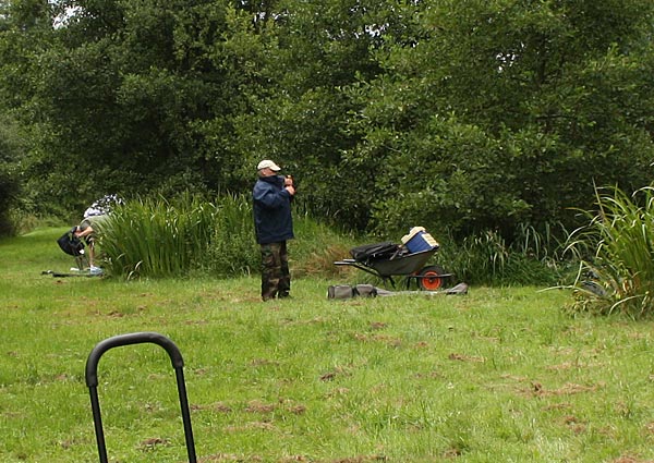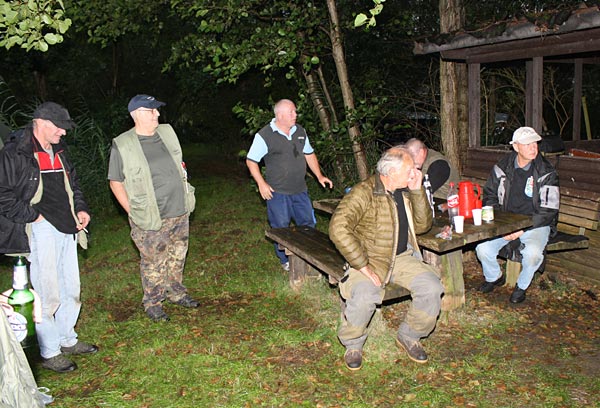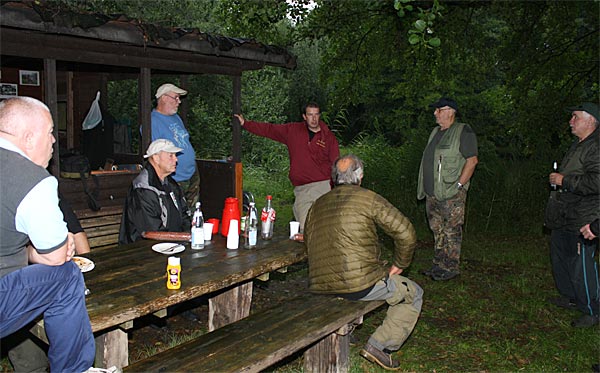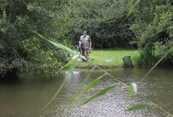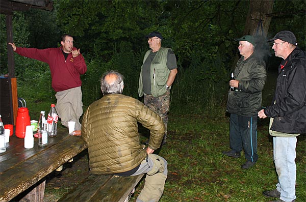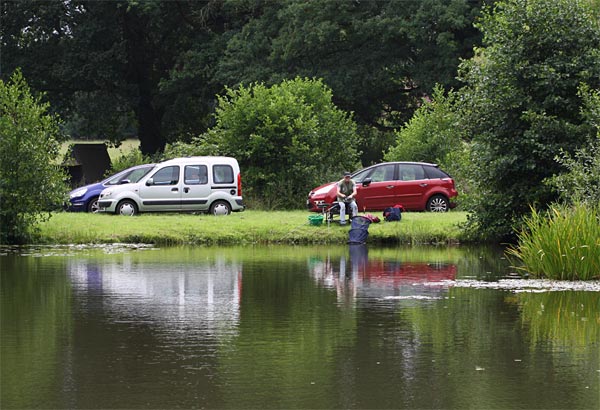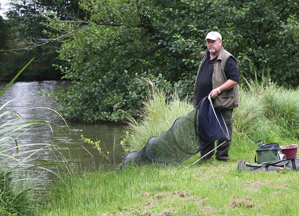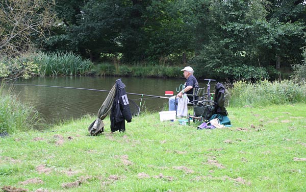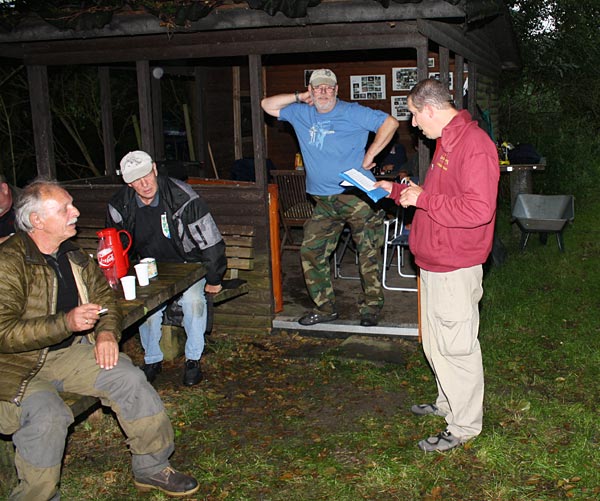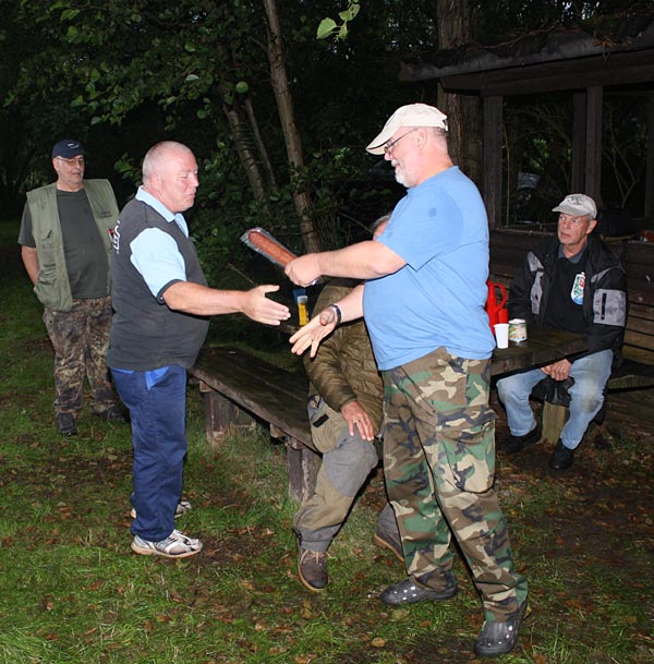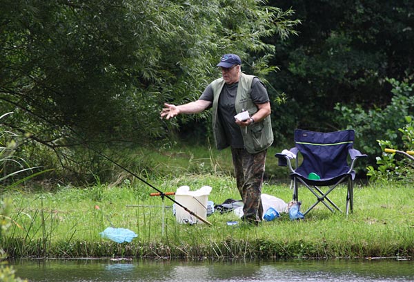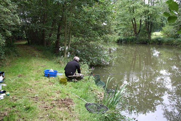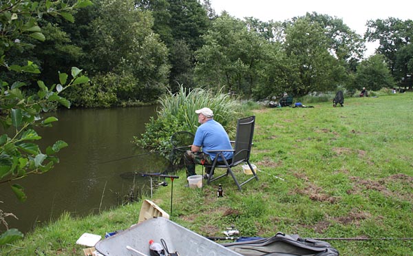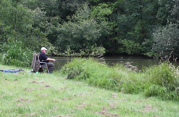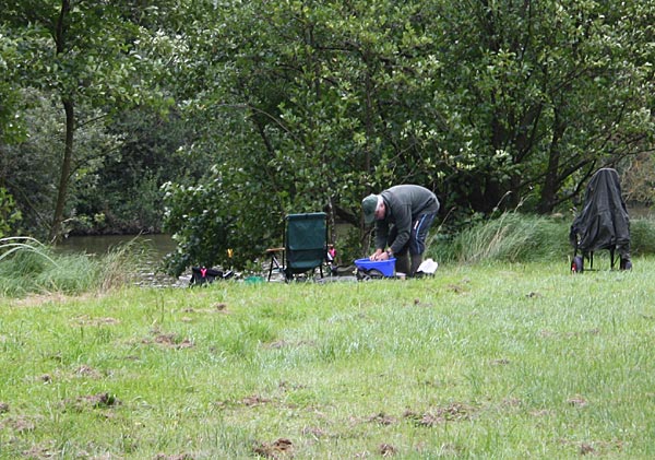 Unser Ehrenvorsitzender Heinrich war leider verhindert - so war sein Stammplatz diesmal in der freien Verlosung und Roland freut sich über den kurzen Weg zum Platz. Da es in den letzten Tagen immer wieder kräftige Schauer gab, konnten die Angler leider nicht das Gewässer entlang fahren. Einige Stellen der Wiese waren einfach zu nass.
