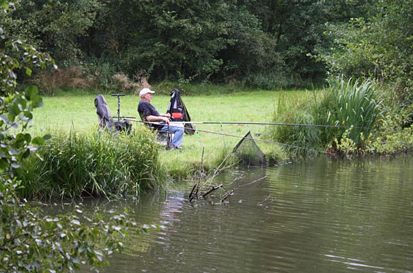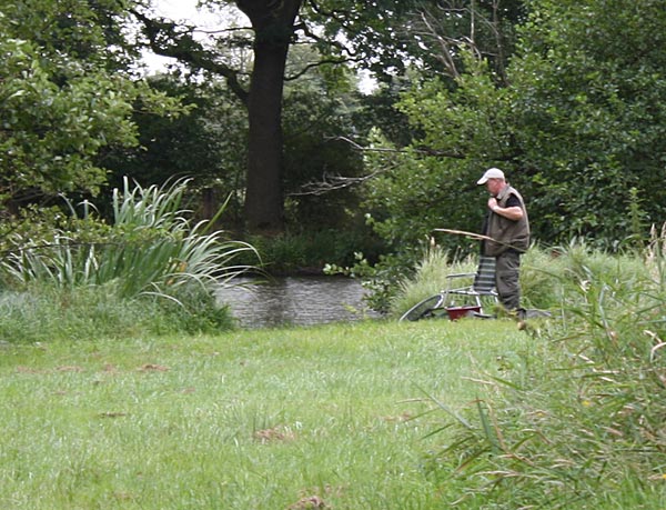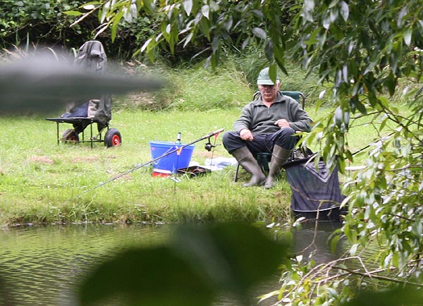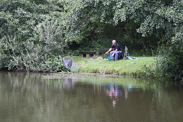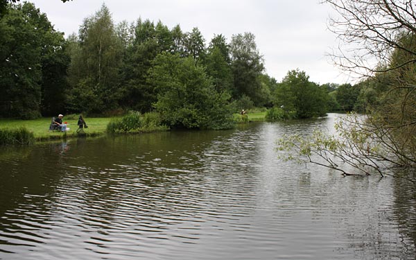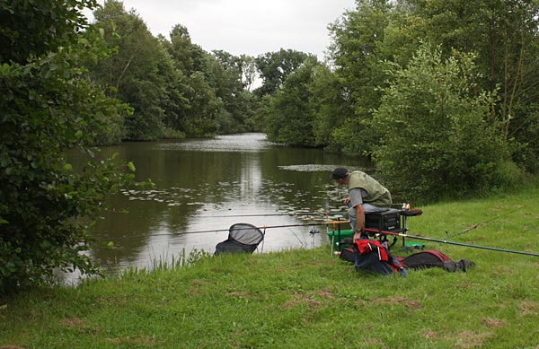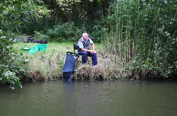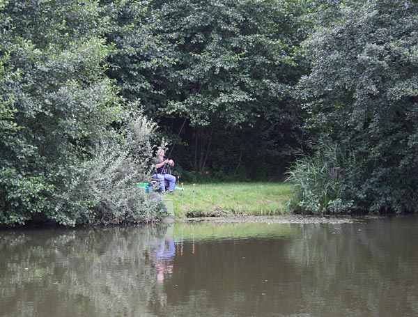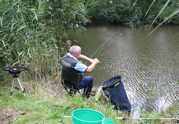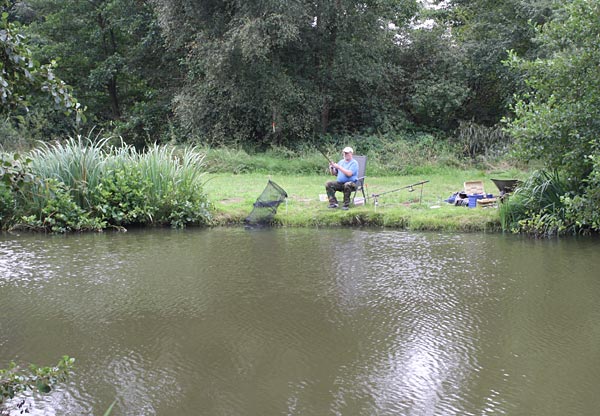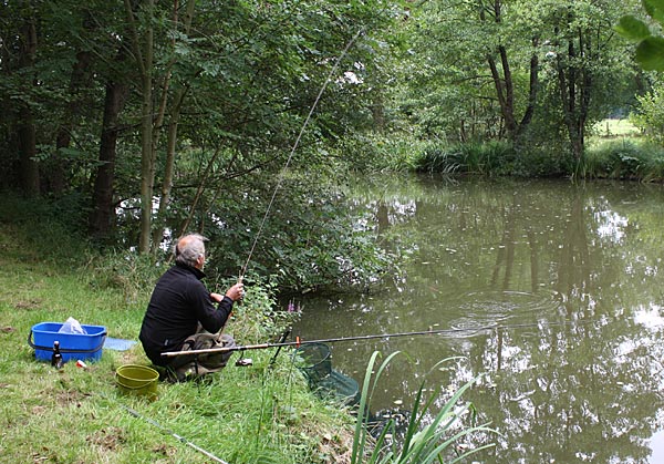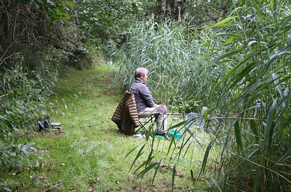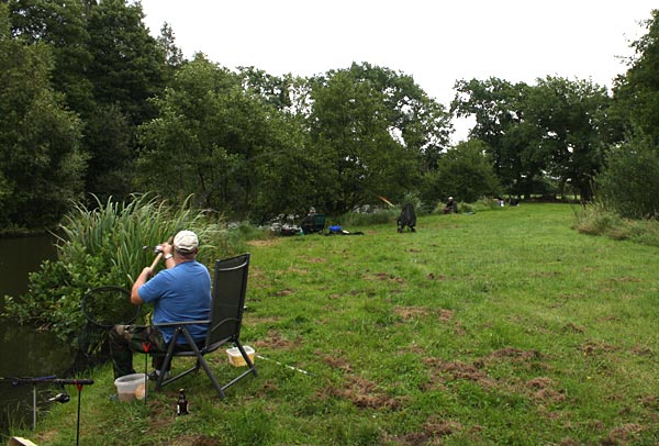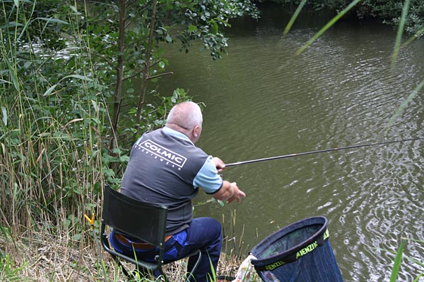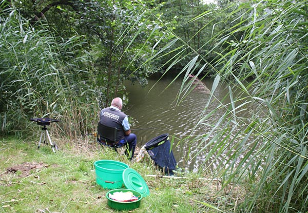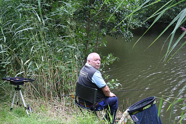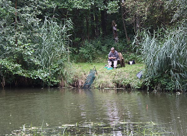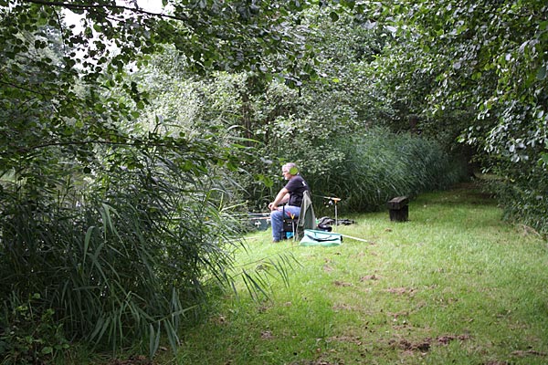 Gegenüber am rechten Arm des Gewässers liegt (sitzt) Wolfgang auf der Lauer. Auch er hatte viel zu tun nach dem Tipp, einfach direkt auf Rutenlänge vor den Füßen zu angeln.