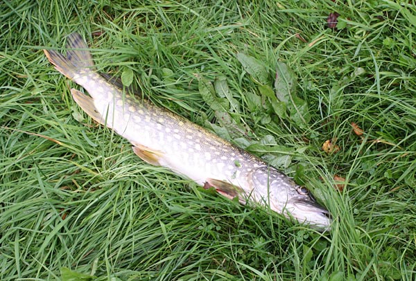 Raubfisch-Spezi Gunter (nicht mit dem schwarzen Schwan zu verwechseln) hat zugeschlagen: ein guter Küchenhecht (1380g) liegt im Gras