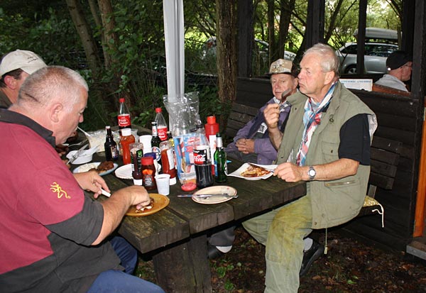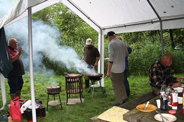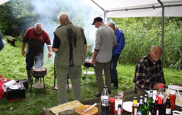 Draussen wird noch nachgefuttert; die Griller haben Pause und Uwe hat den Grill übernommen.