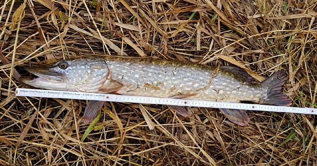 Viele Stellen auszuprobieren zahlte sich für Jan aus: ein fetter 77er Hecht mit 3kg, der größte des Raubfischangelns, fiel auf seinen Kunstköder herein (den er kurz vorher von Matze zum Testen bekam ;-)
