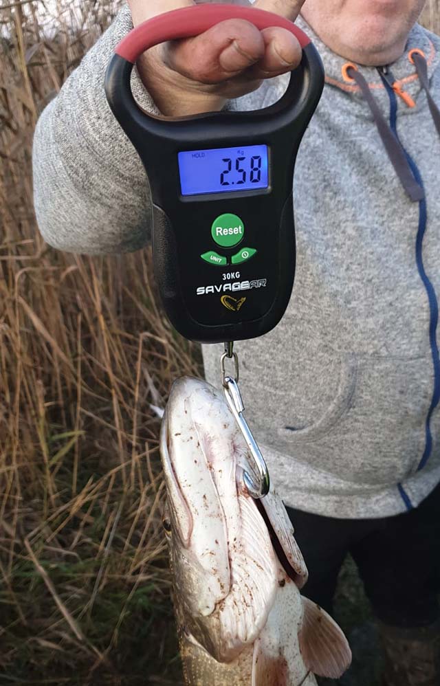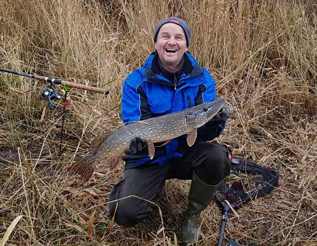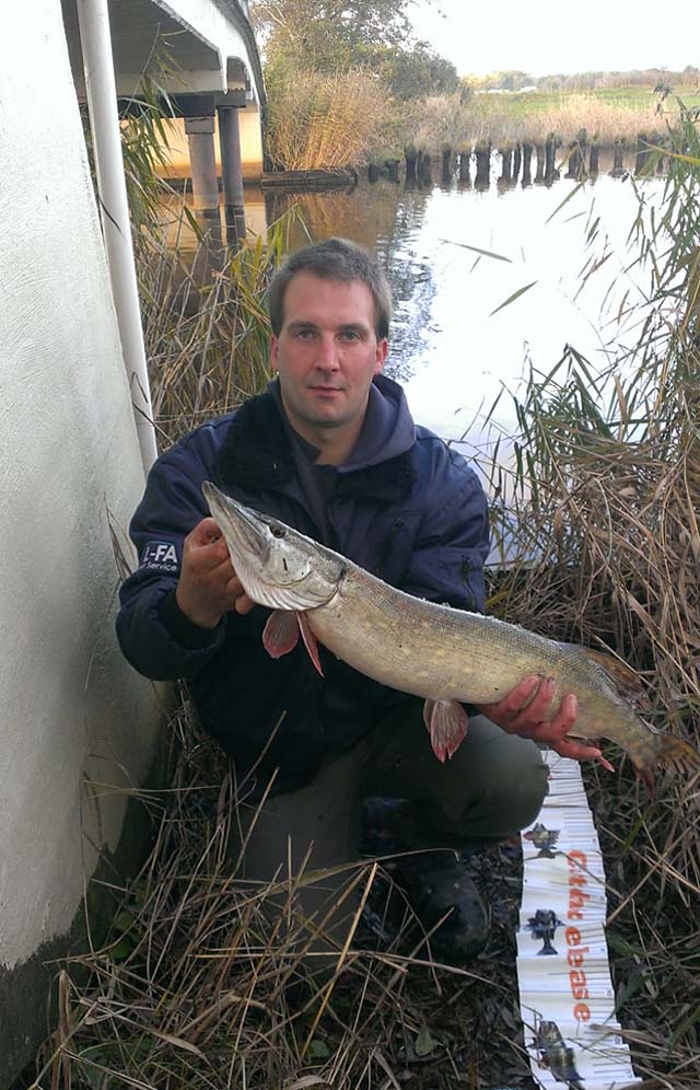 Wolfgang fing den ersten Hecht des Sonntags mit 2550g; kurz danach meldete sich auch bei Ulf ein Hecht zum Landgang: da freut er sich zu Recht: 2700g