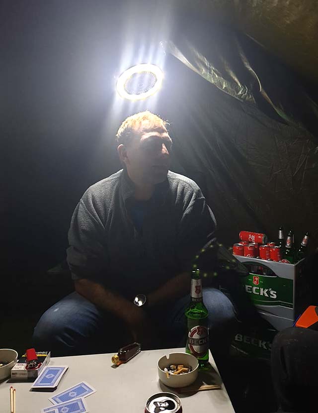 Die "Drei von der Tankstelle", diesmal zu viert, haben eine eigene Tradition, ihre Plätze am Wasser zu verteilen....gegen 14:30 hatten die Kümmerlinge endlich unterschiedlcihe Zahlen parat, um die Angelplätze zu belegen.
