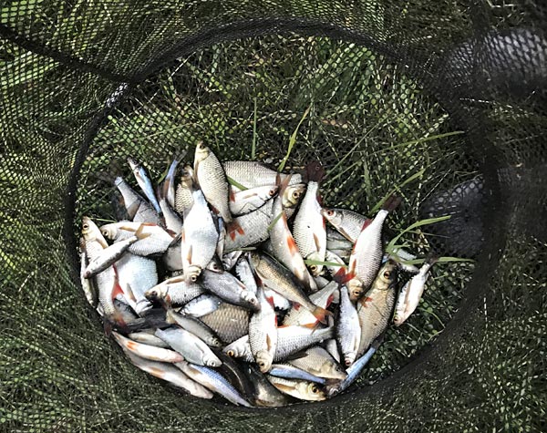 Matze hat auf dem Endplatz an der Verbreiterung ein Sammelsurium an Kleinfisch: Karpfen, Karausche, Rotauge, Rotfeder, Gründling, Güstern und kleine Brassen. Alles dabei! Kleinvieh macht auch Mist: am Ende waren es fast 2kg Fisch...bei 70 hörten wir auf zu zählen...