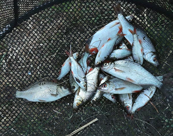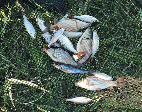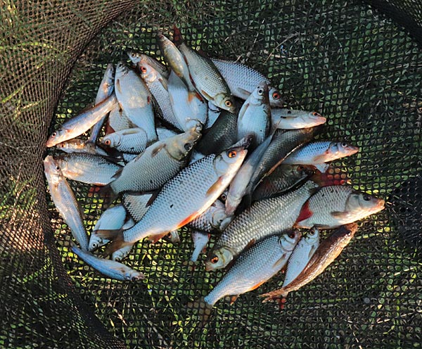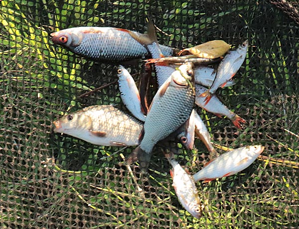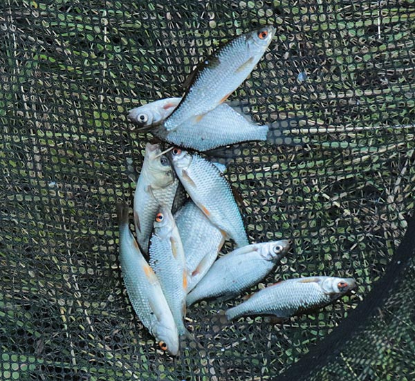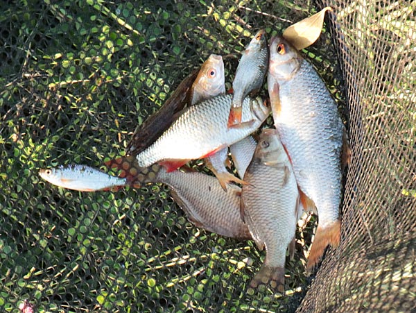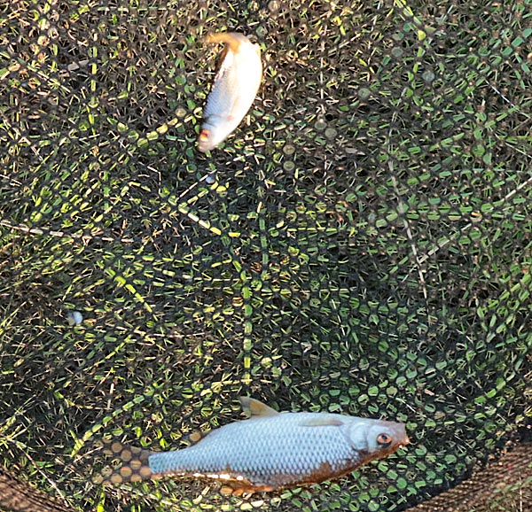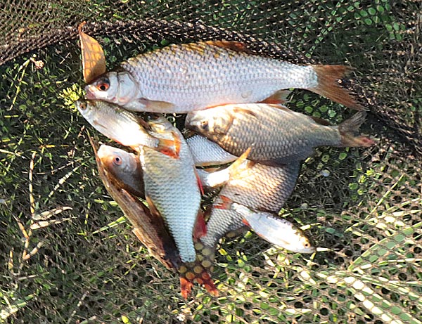Etwas mehr Kleinfisch und ab und zu guckt mal ein Baby-Karpfen dazwischen raus. Wie immer der Hinweis: Karpfen haben Barteln, Karauschen nicht!