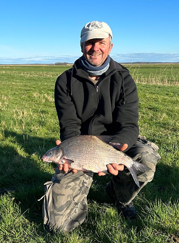 Jürgen saß in der Winterzone, konnte sich aber warm angeln. Der längste Brassen des Tages mit knapp 56cm....