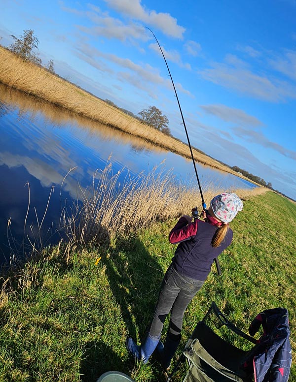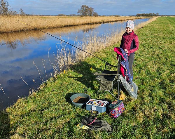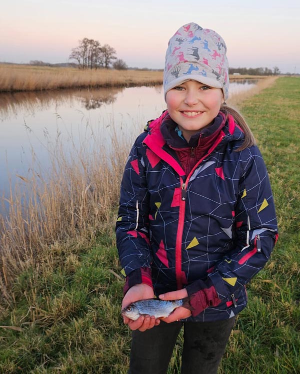 Gegen Ende des Angelns verlor dann die Sonne deutlich an Kraft. Es wurde recht schnell sehr kühl. Trotzdem strahlt Juna mit ihrem Fang.