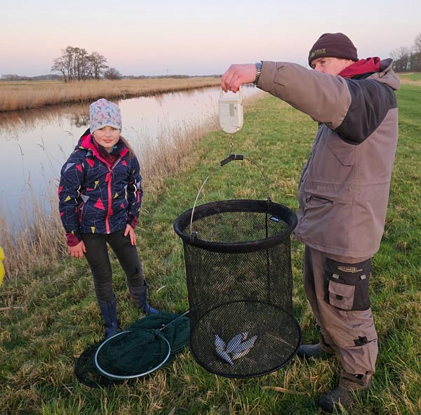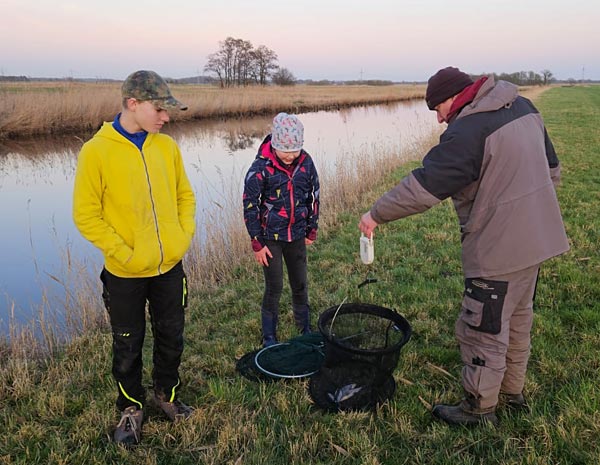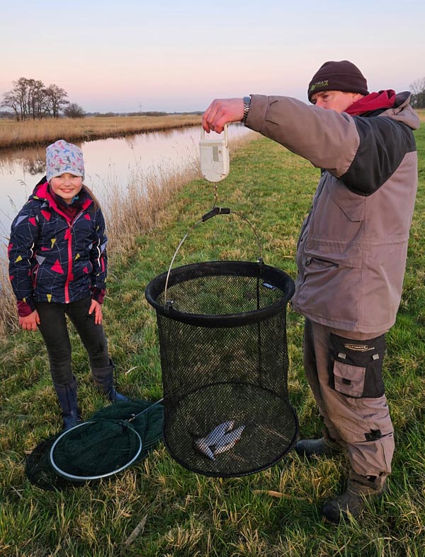 Nur Olaf konnte eine fetten Brassen fangen und gab ihn für das Foto gleich mal an die staunende Jugend. So bleiben die eigenen Finger sauber 😜