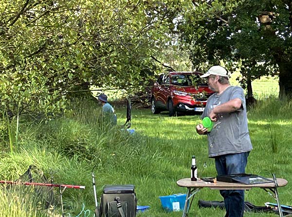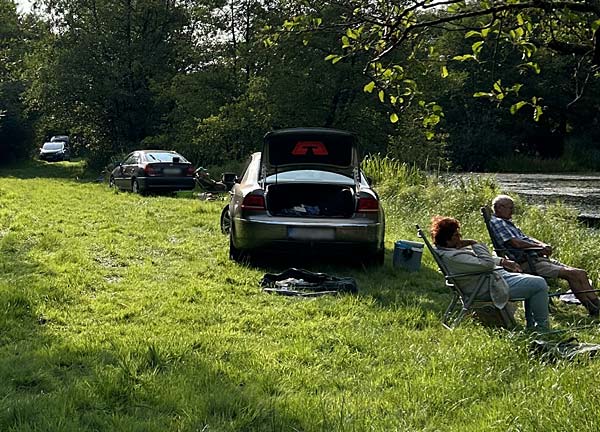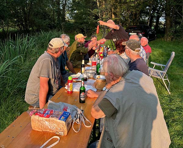 Premiere 1: kein Regen! Weder vorher, noch nachher und schon gar nicht während des Angelns. Unser Mut, auf den Zeltaufbau zu verzichten, wurde belohnt. Die 10 Angler plus 2 weibliche Gäste konnten herrliches Sommerwetter genießen.
