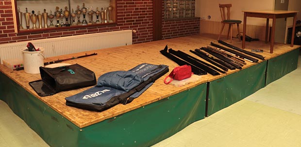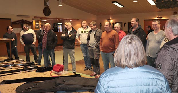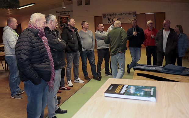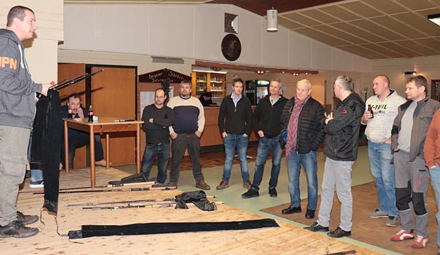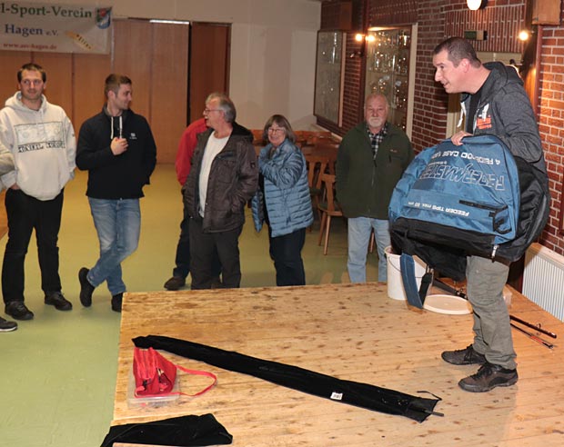 Auf der Bühne lag Angelgerät aus dem Nachlass von Uwe Steinbrecher zur Versteigerung zu Gunsten der Jugendgruppe bereit.