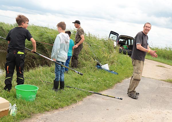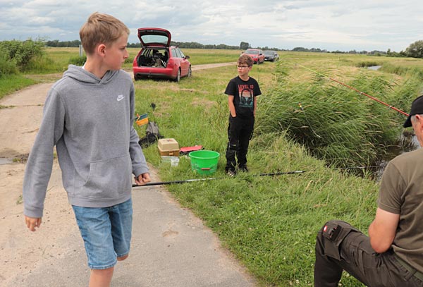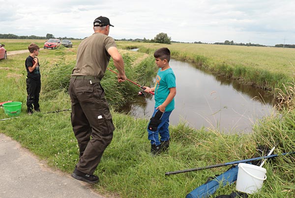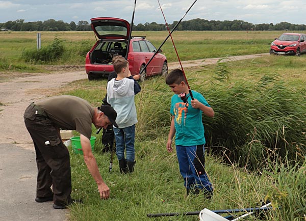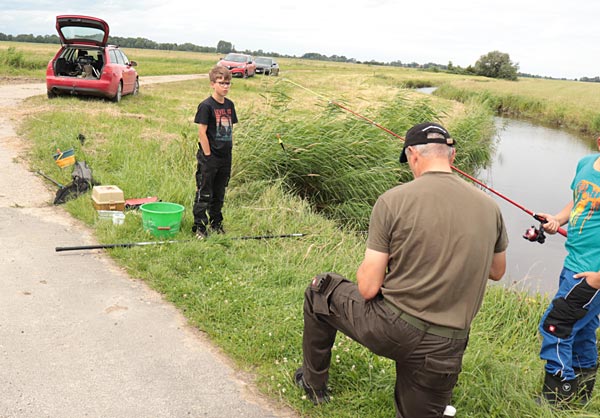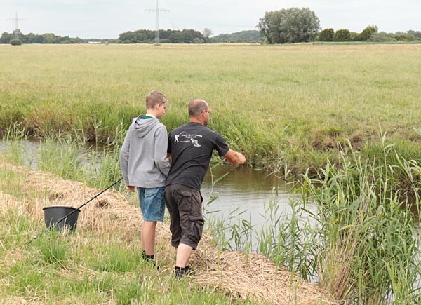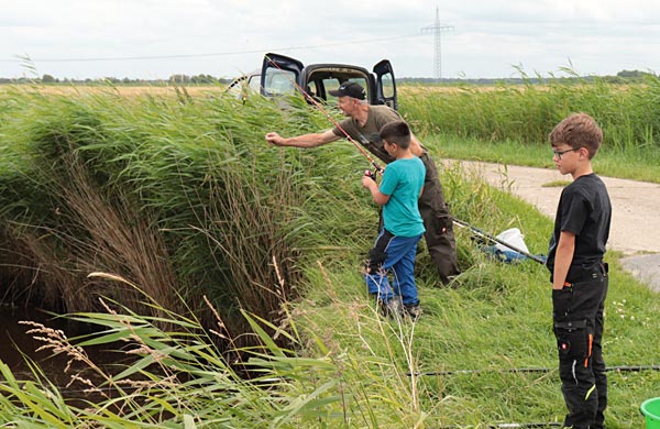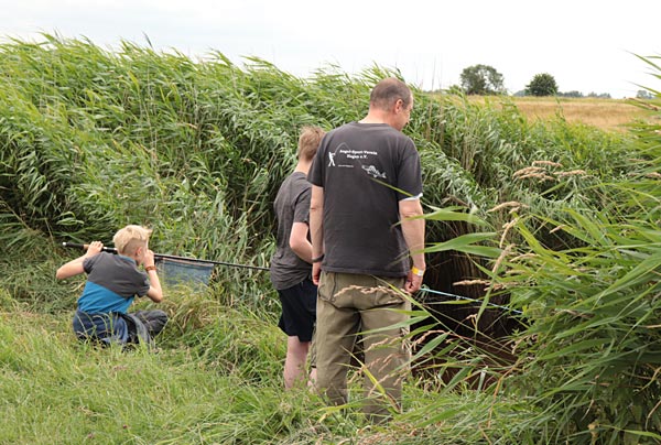 Neben Ulf waren auch Rüdl (natürlich hinter der Kamera) und Andreas als Betreuer dabei. Mehr als 2 Kinder pro Betreuer sollten es nicht sein, denn zum Einen wird immer Hilfe beim Enttüdeln benötigt und zum Anderen ist auch immer auf den korrekten Umgang mit den Fischen zu achten (nasse Hände, Hakenlösen….)