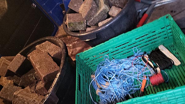 Markus besorgte Steine und Tüddelband für die Beschwerung.