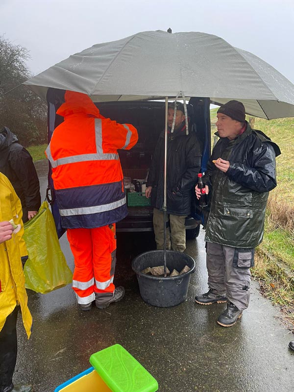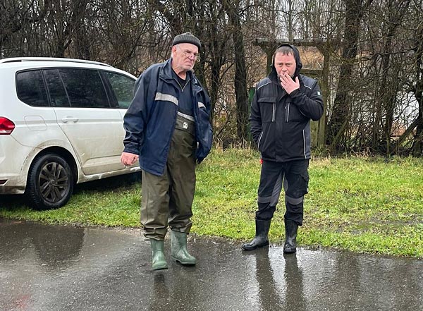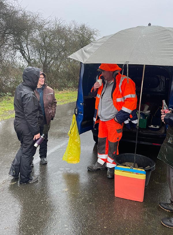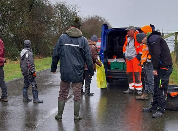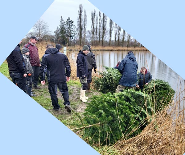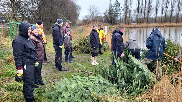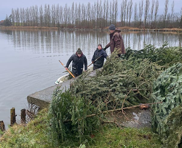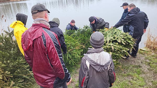 Trotz des Regenwetters war die Beteiligung wirklich gut. Es waren ausreichend Helfer da, um gleichzeitig Beschwerungen zu basteln, Tannenbäume zu schleppen und am VT und Aalteich zu verteilen.