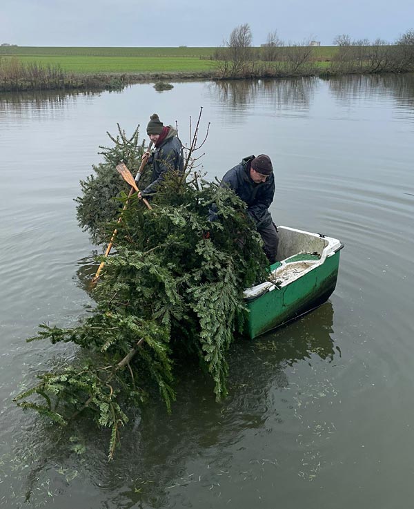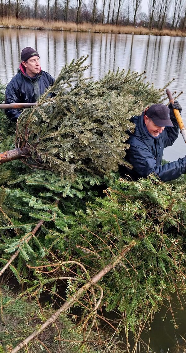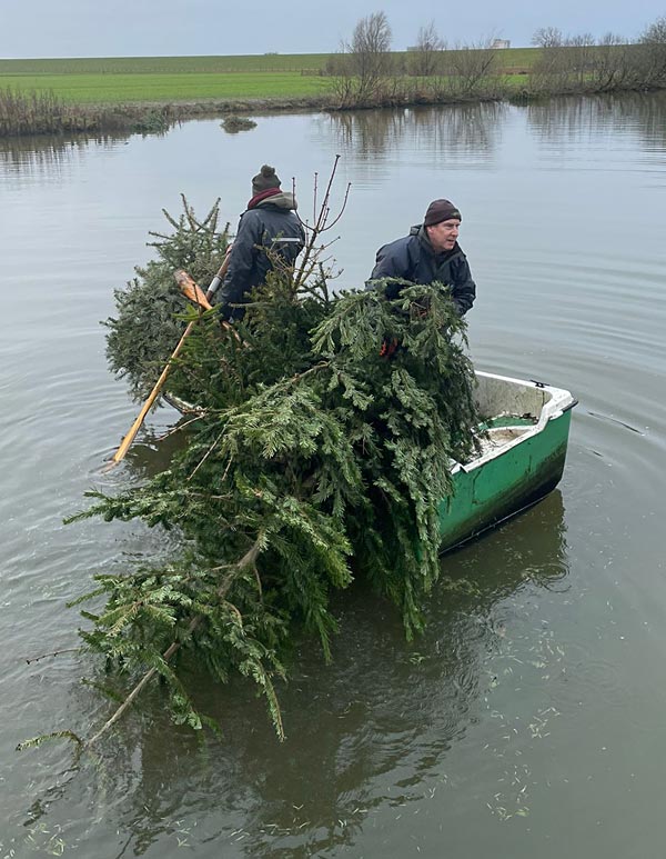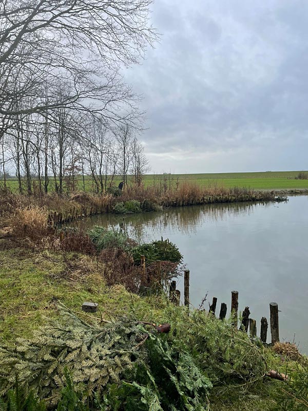 Für diejenigen, die sich fragen, was das überhaupt soll: Tannenbäume sind aufgrund der vielen Nadeln ideales Laichhabitat für Barsche, Weißfische und Karpfen. Bei Sonneneinstrahlung staut sich zwischen den Ästen die Wärme und es wird durch entstehendes Zooplankton gleich die erste Nahrung für die Brut mitproduziert. Nebeneffekt: in Ufernähe ausgebracht, wird auch das abbrechende Ufer gesichert. Das die Theorie auch in der Praxis funktioniert, zeigt der Karpfennachwuchs des letzten Jahres.