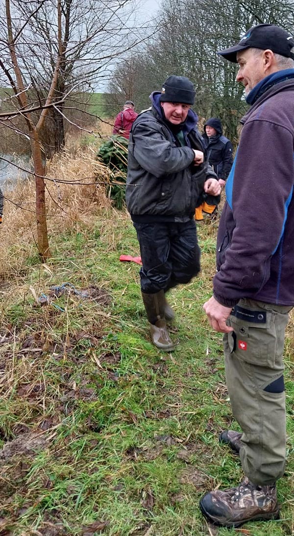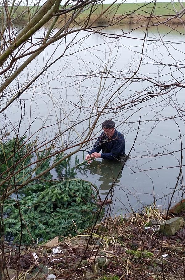 Am Aalteich wurde alles ohne Boot gemacht: Bäumchen noch oben schleppen per Hand und ab in die Wathose.