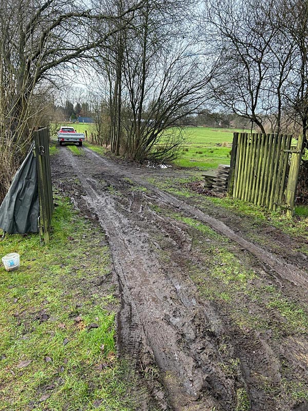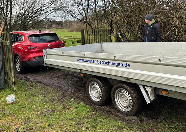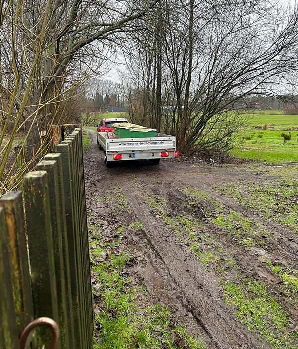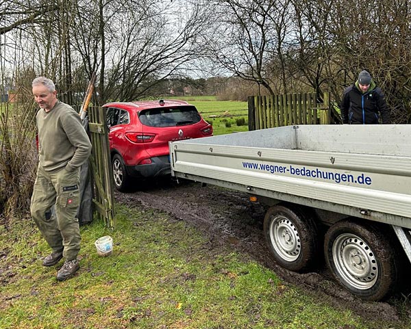 Hilfreich auch der große Hänger. Mit ein paar Fahrten war das Material vom Abladeplatz an der Betonplatte schnell auf die Deichseite und zum Aalteich verbracht.