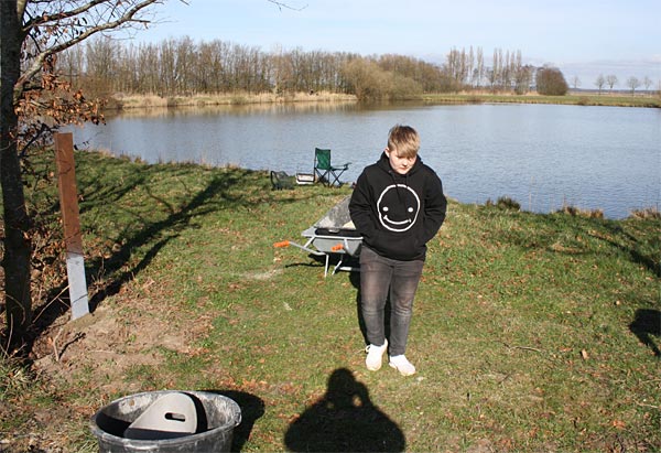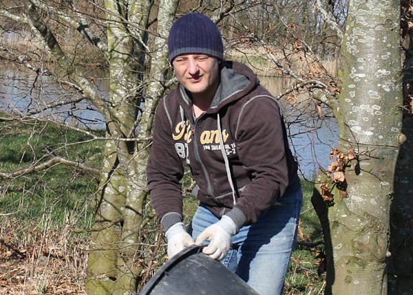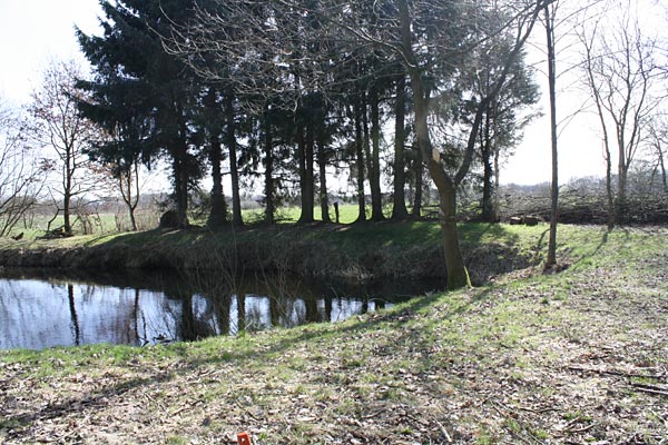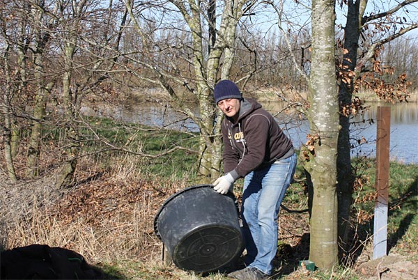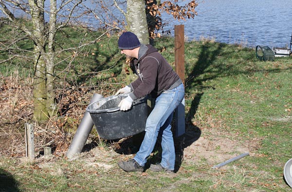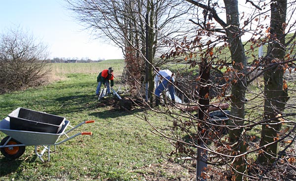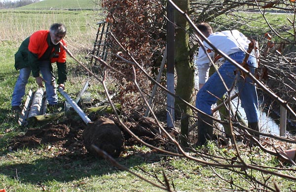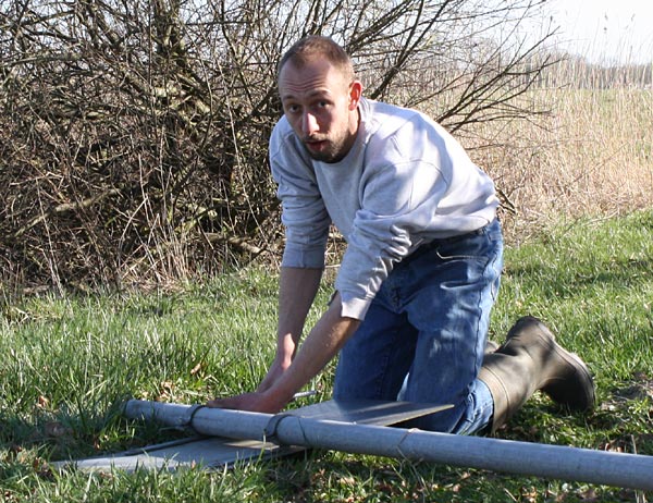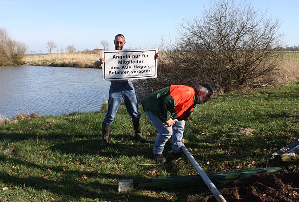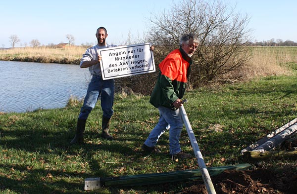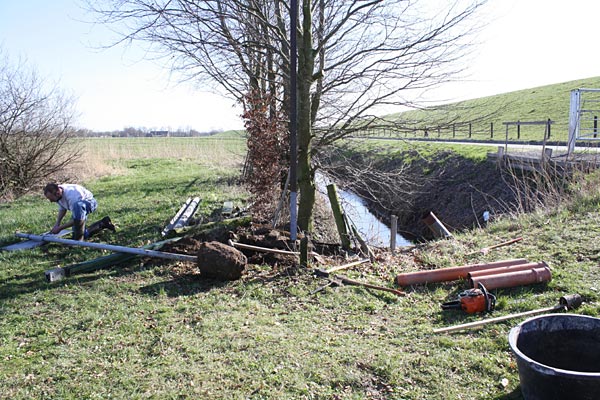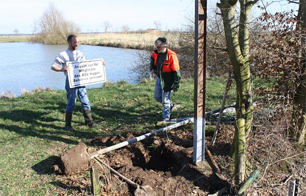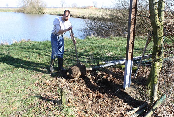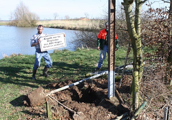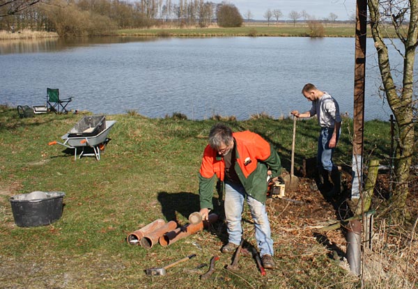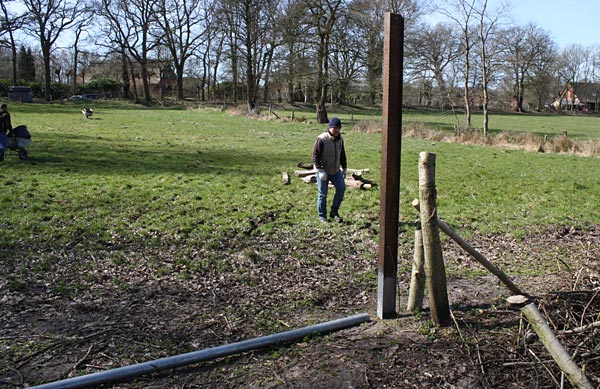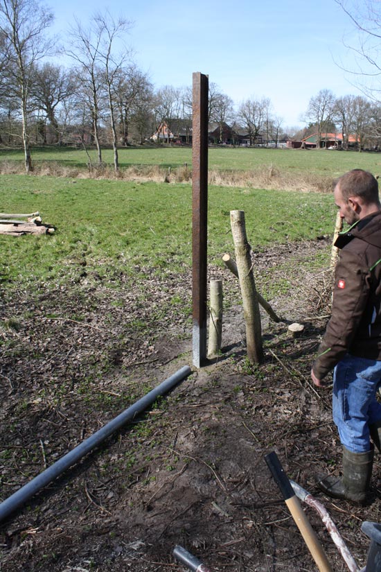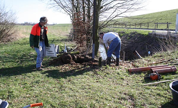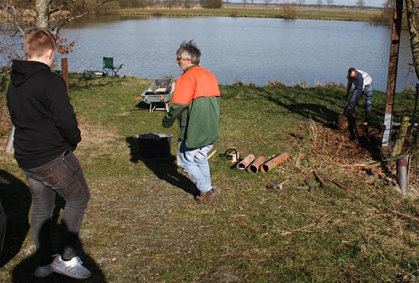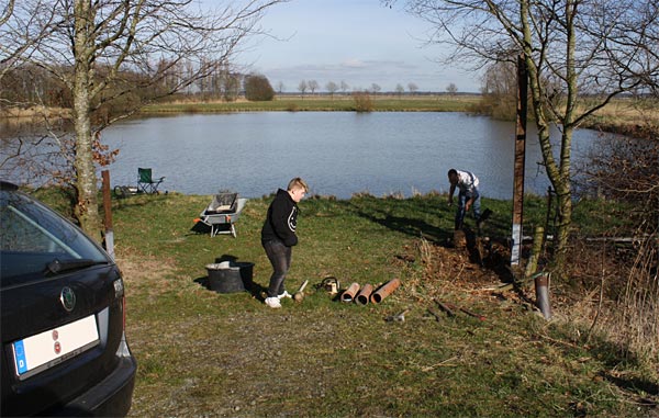 dafür vorgebohrten Erdlöchern eingesetzt. Die Wasser-Schlamm-Ansammlung konnten wir zuvor mit