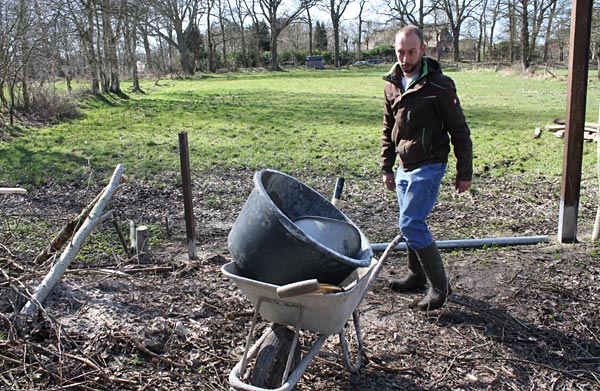 Andreas schiebt die erste Ladung Geräte schon wieder zurück zum Anhänger ..