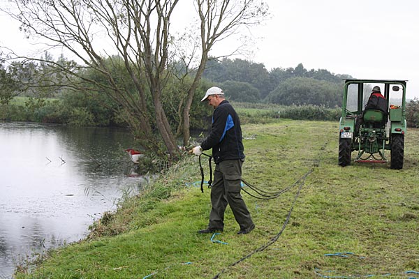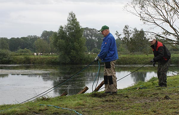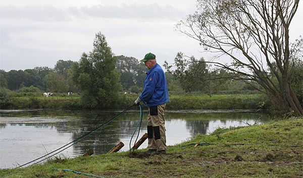 Uferseite ausnutzen, damit soviel Seillänge wie möglich, auf einmal gezogen werden kann..