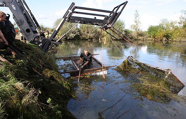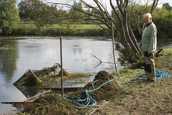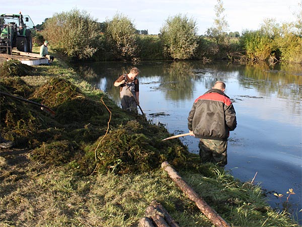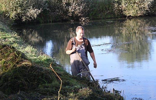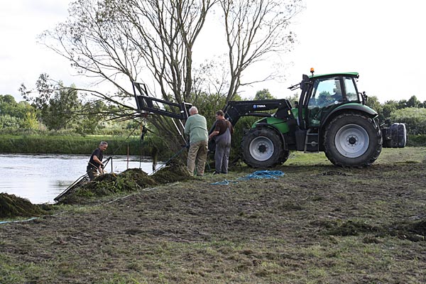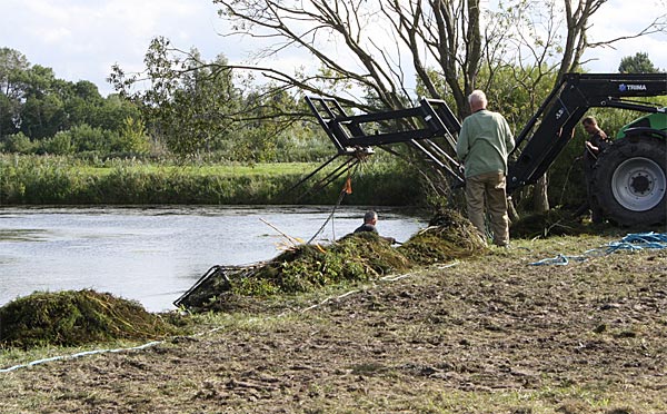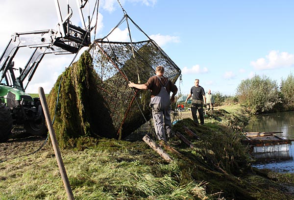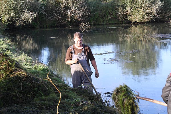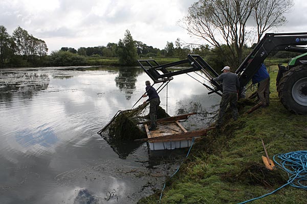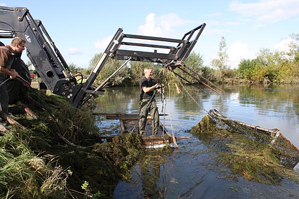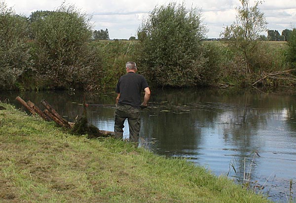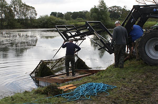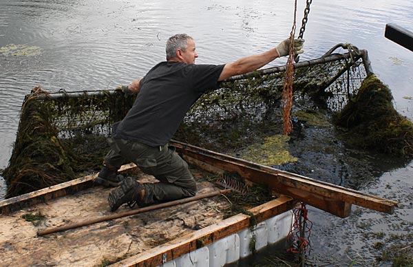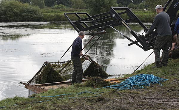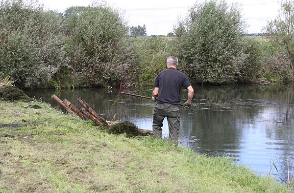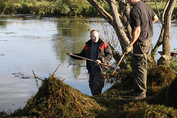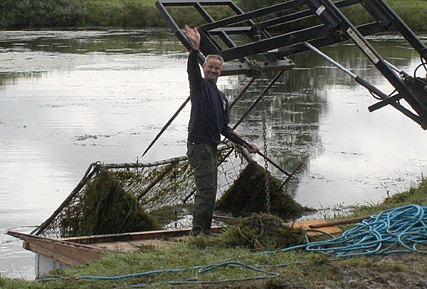 .. während dessen hat Ulf eine Harke in den Händen und holt den Krautbulken am Ufer aus dem Wasser ..