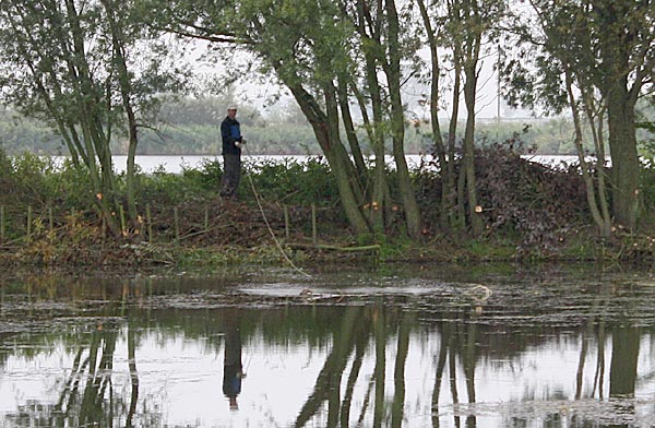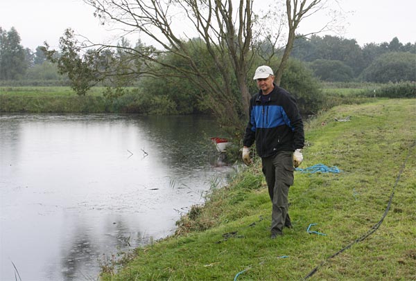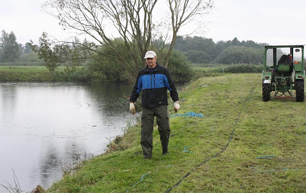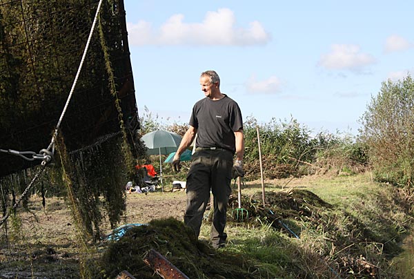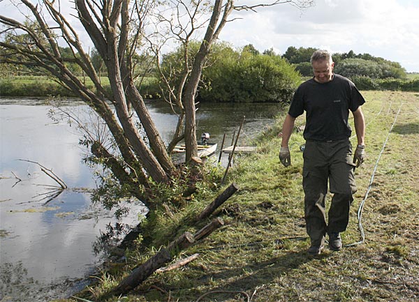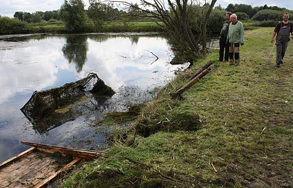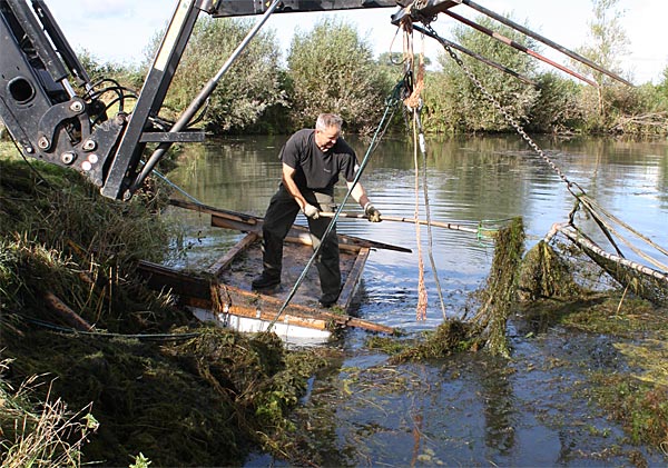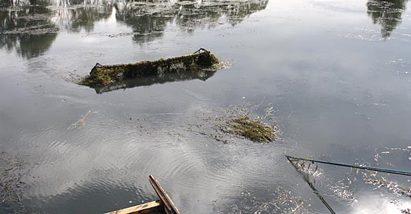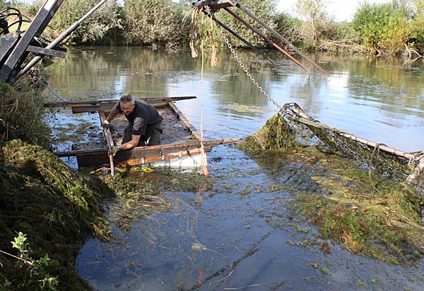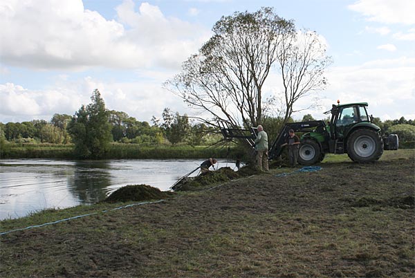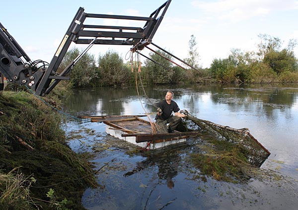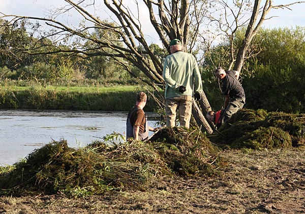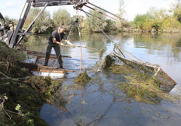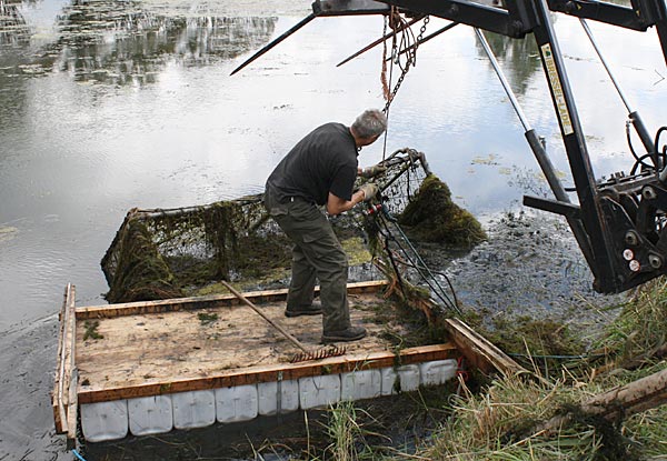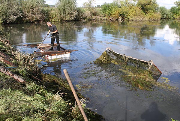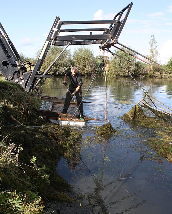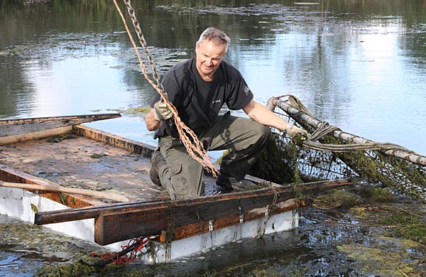 .. während dessen hat Ulf eine Harke in den Händen und holt den Krautbulken am Ufer aus dem Wasser ..