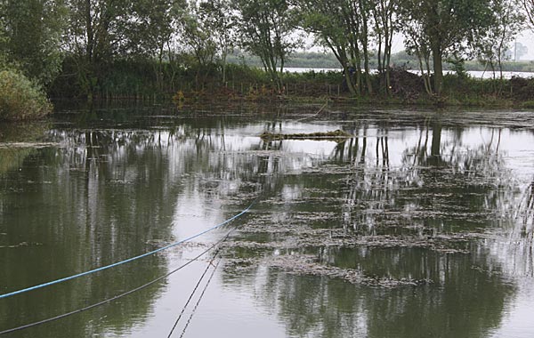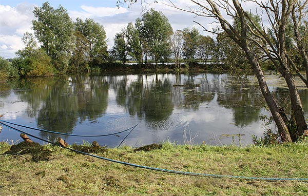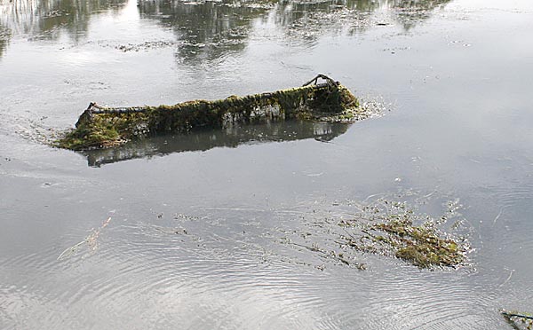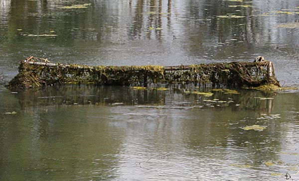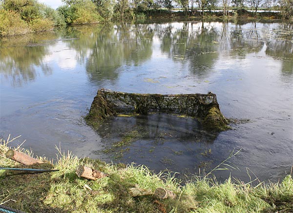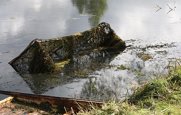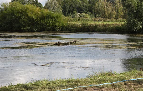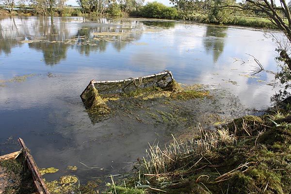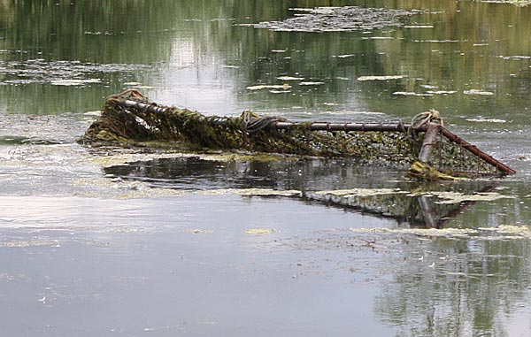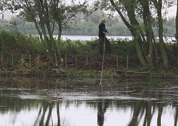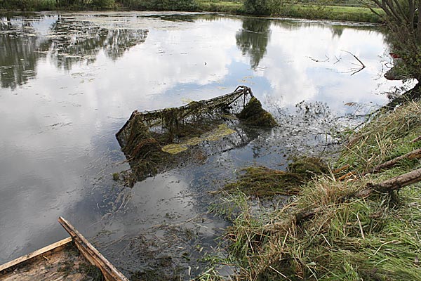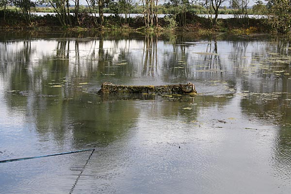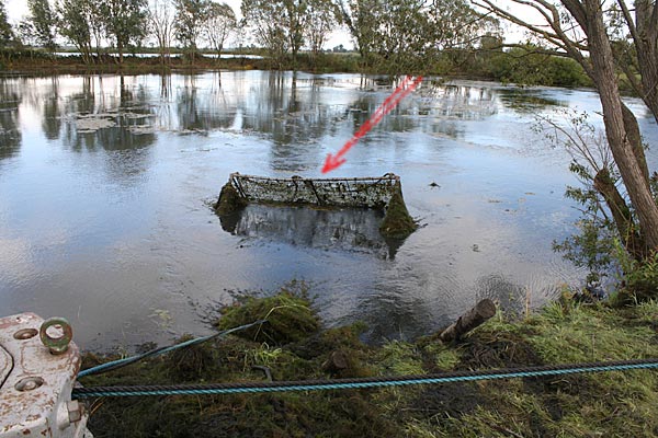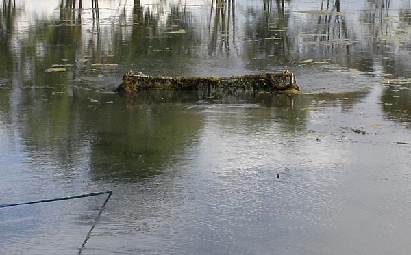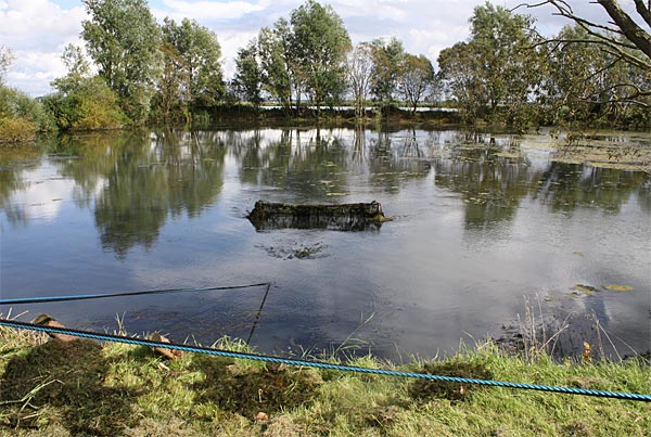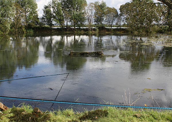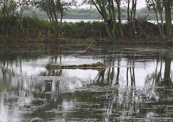 .. kurze Zeit später wandert der Käfig schräg durch den Teich; wegen dem Baum machten wir einen
