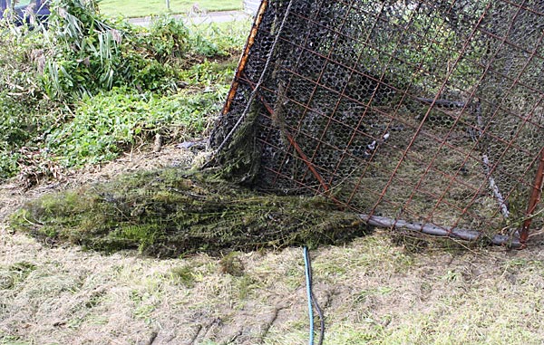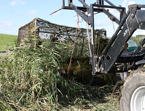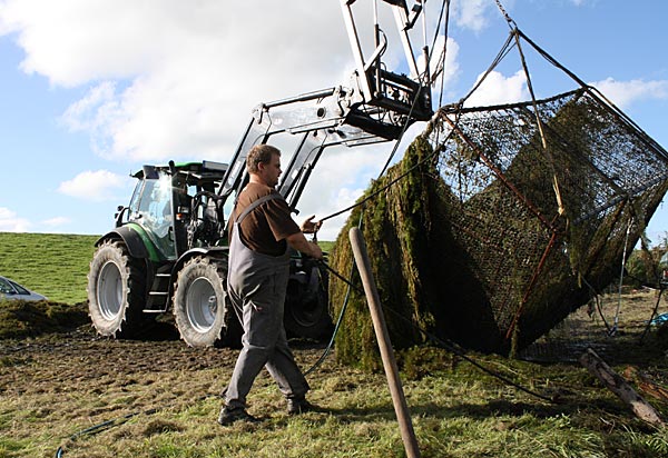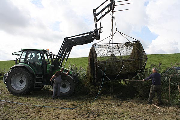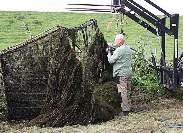 .. das Krautchaos vor dem Käfig mit der Gabel in den Käfig werfen, dann wird alles angehoben ..
