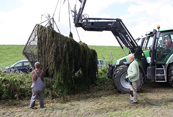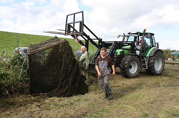 den Käfig auf den Anhänger heben und dann ab zum Teich damit.