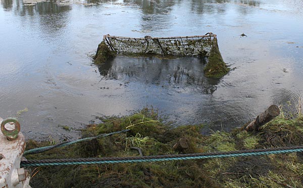 der Käfig rutscht auf den Keilen ab und legt sich auf den Gewässergrund ..