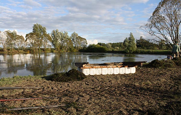 4 Auftriebskanister für das Netz; den Bootsmotor incl. Tank; 4 Pfähle + die Ramme; die Abrutschkeile für das Floß