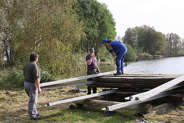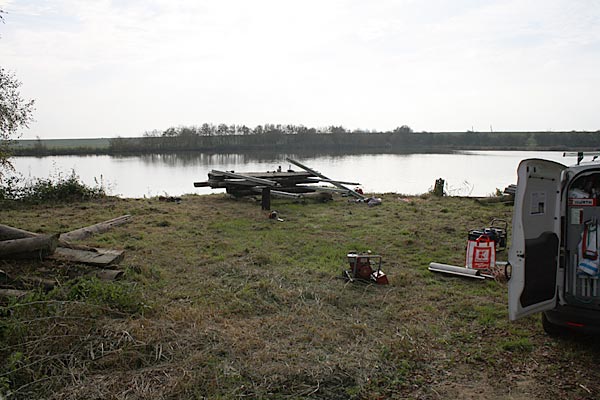 Während ein Teil der Mannschaft Lagerhölzer für die Uferschutzelement zurecht legte
