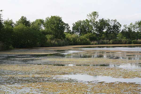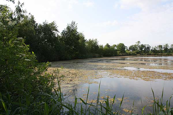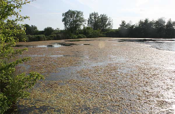 Vom Gewässergrund bis über die Wasseroberfläche Kraut und dazwischen der Algenteppich, der von