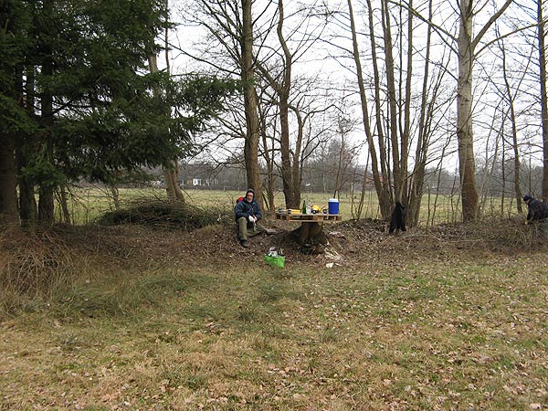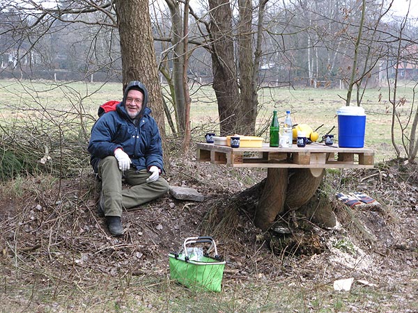 Auf der Holzpalette kann man die Reste unserer Verpflegung erkennen. Gewässerwart Olaf hat sich hier viel Mühe gemacht. Mit lecker Matjesbrötchen frisch aus dem Hafen; aufwärmender Brühe und Getränken wurde die Arbeitsgruppe gut versorgt. Echt schade, dass Olaf sich so viel Mühe gemacht hat und nur 4 Leute zum Arbeitsdienst angetreten sind.