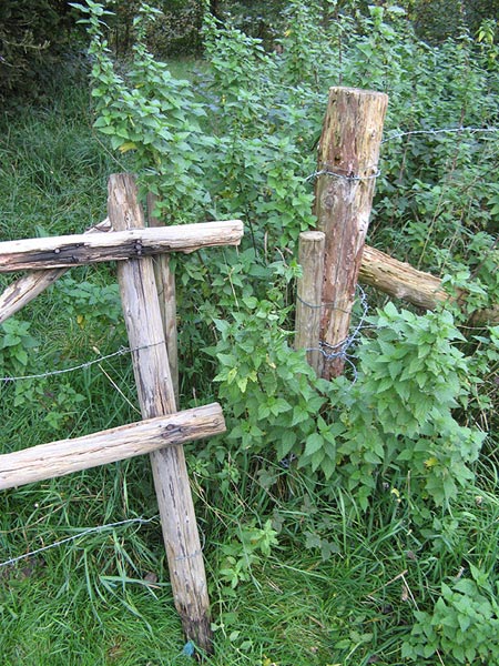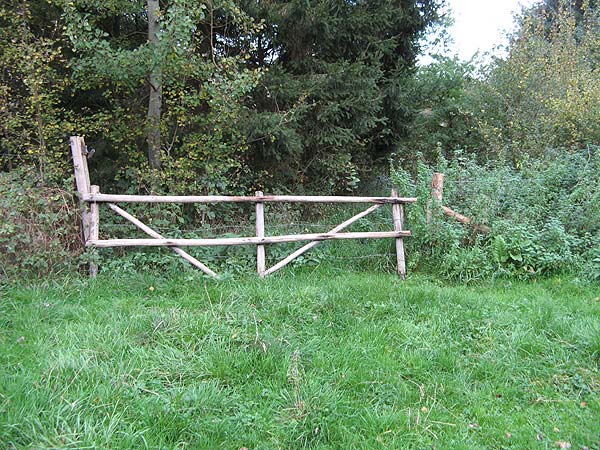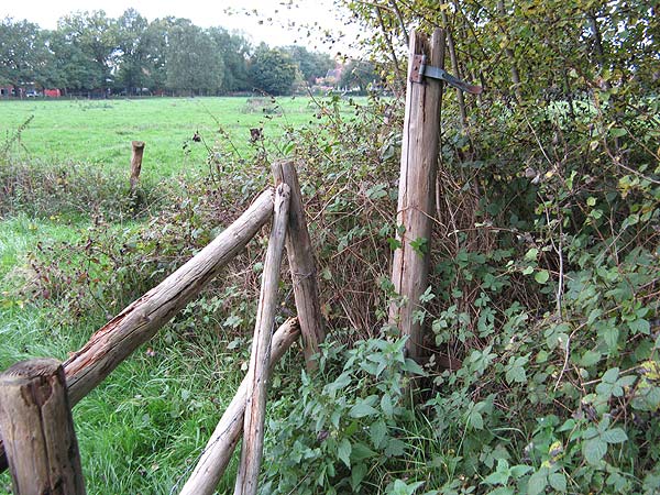 Das Tor am Eingangsbereich; morsches Holz und abgefaulte Pfosten erschweren den Zugang.
