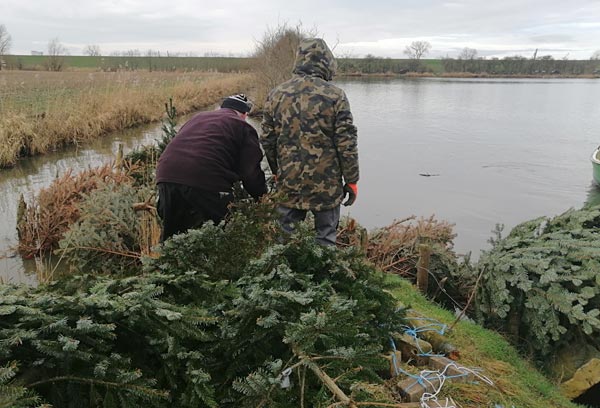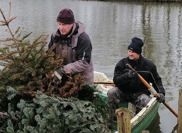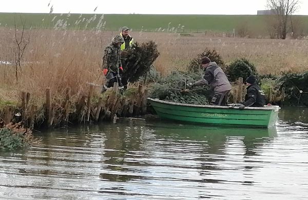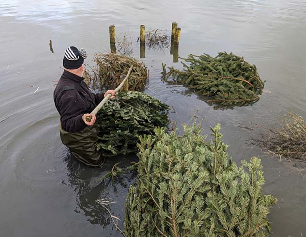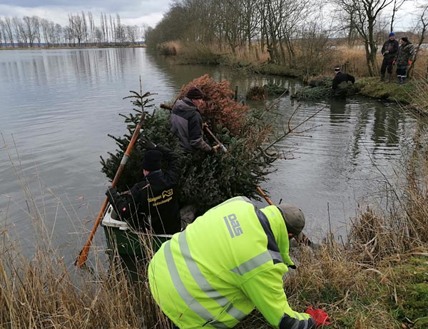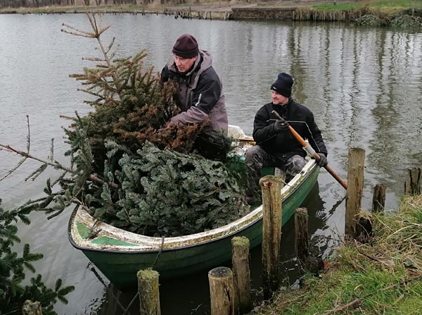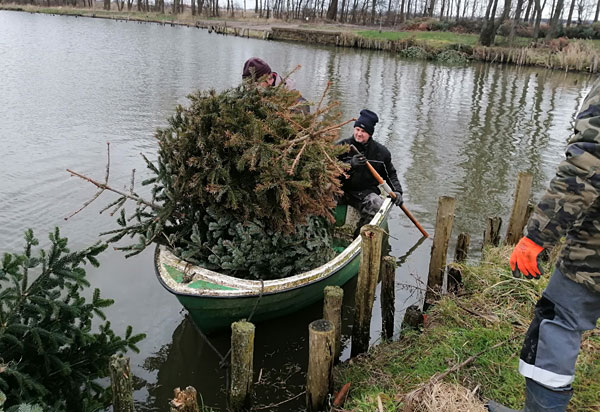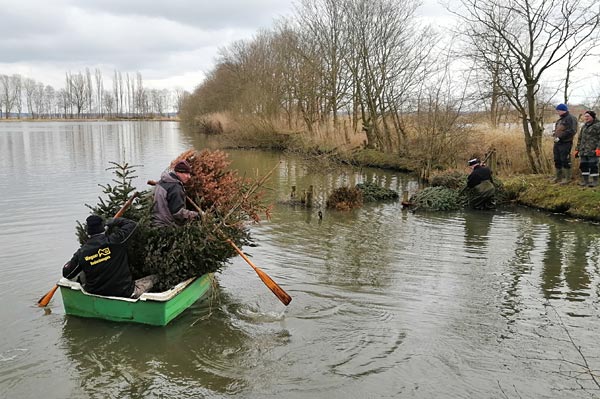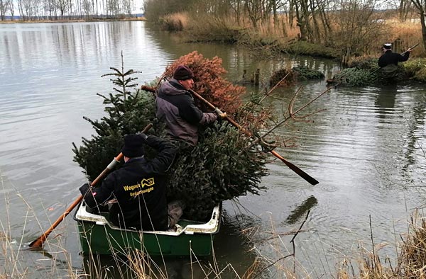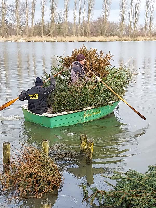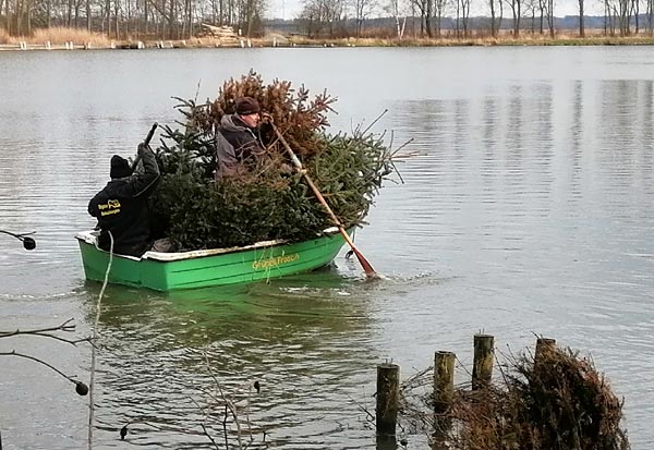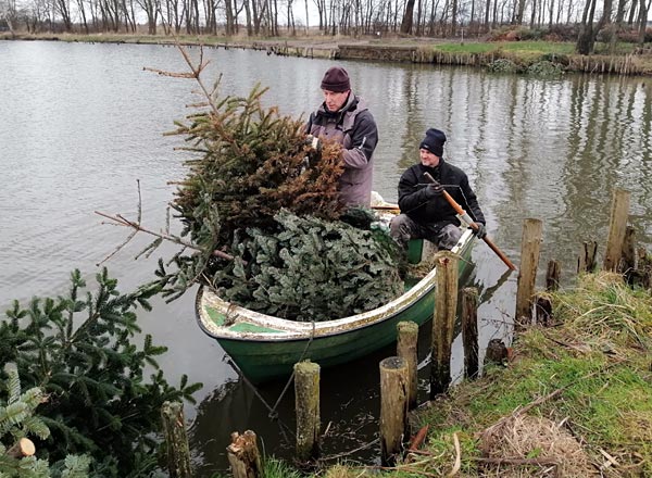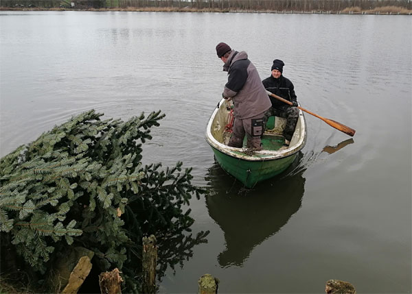Die Weihnachtbäumchen flogen zielgenau ins Wasser; wurden wo nötig, mit Draht