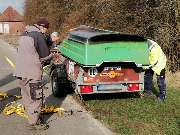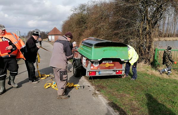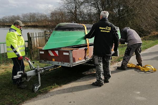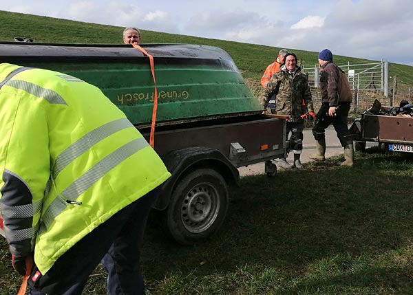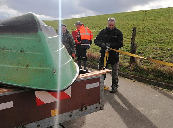 Gelände. Boot aus dem Wasser ziehen, "entwässern", auf den Anhänger laden