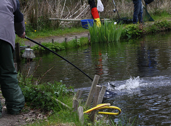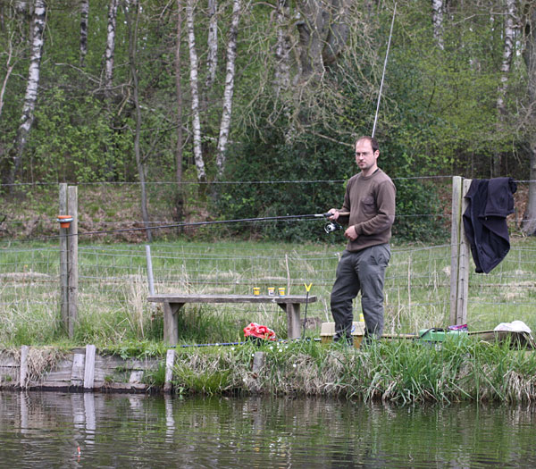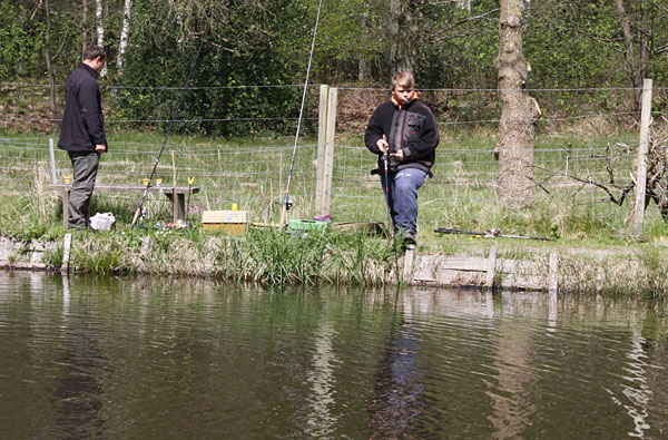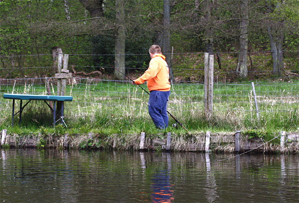 Die Forellen stehen offenbar im vorderen Teil des Teiches und Nico hat sich angepirscht....das ist das gute, wenn man den Teich mietet: jeder kann angeln wo er will und kommt mit etwas Glück zu seinem Fisch.
