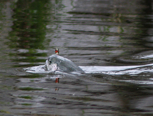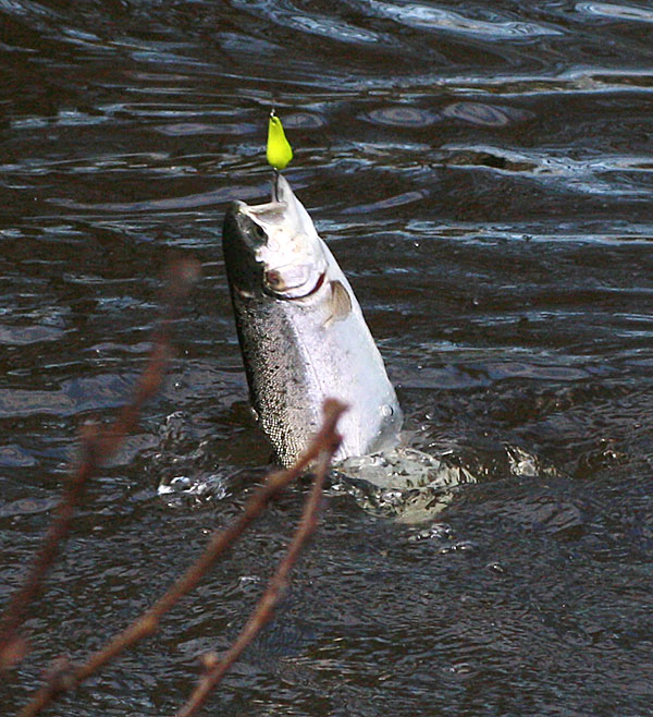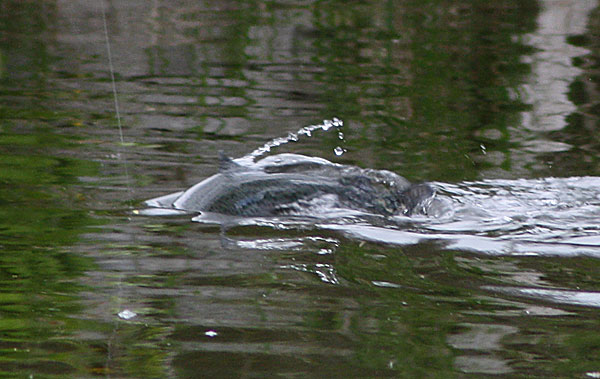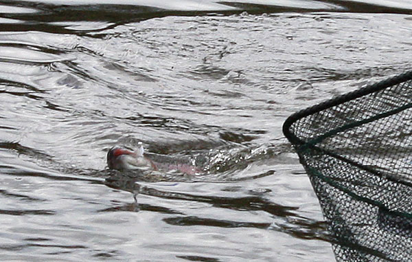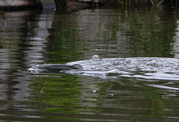 Hier hat eine Lachsforelle gebissen und wehrt sich ordentlich.